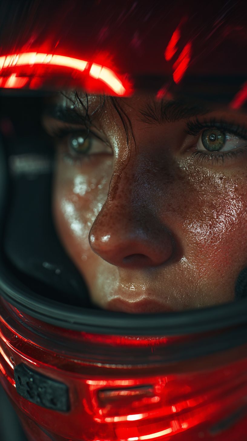 Extreme close-up portrait of a stunning female race car driver wearing a glossy red Formula 1 helmet, visor open. She has intense green eyes, sweaty skin texture, pores visible, realistic skin imperfections. Cinematic lighting, red neon rim light, dark moody garage background. Shot on Arri Alexa LF, 85mm lens, shallow depth of field, Kodak Vision3 500T film grain, color graded in red and black, hyper-realistic, 8k resolution --ar 9:16