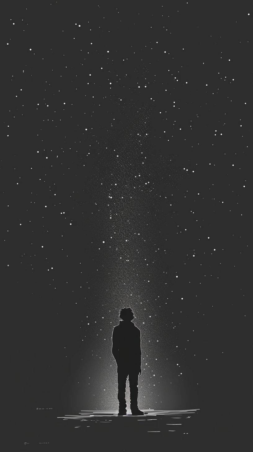 A hand-drawn illustration in minimalist style depicting countless people standing and looking at the sky with tiny, faint stars glistening subtly in the background, emphasizing simplicity and refinement.