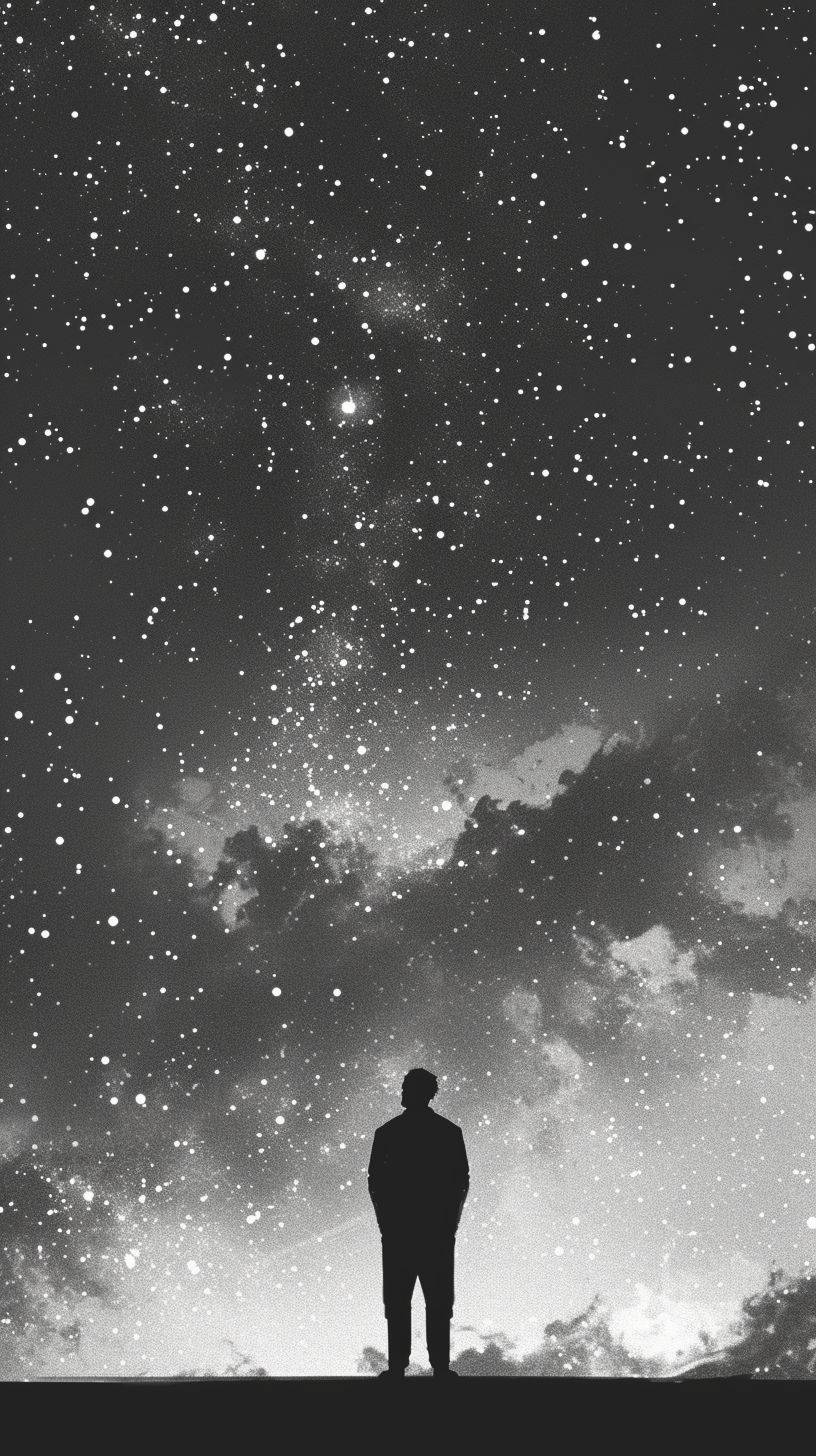 I need a hand-drawn illustration in a minimalist style that sketches countless people standing and looking at the sky against the backdrop of tiny, faint stars glistening subtly. The design must deliver simplicity, refinement, and minimalism with neat lines --ar 9:16 --v 6