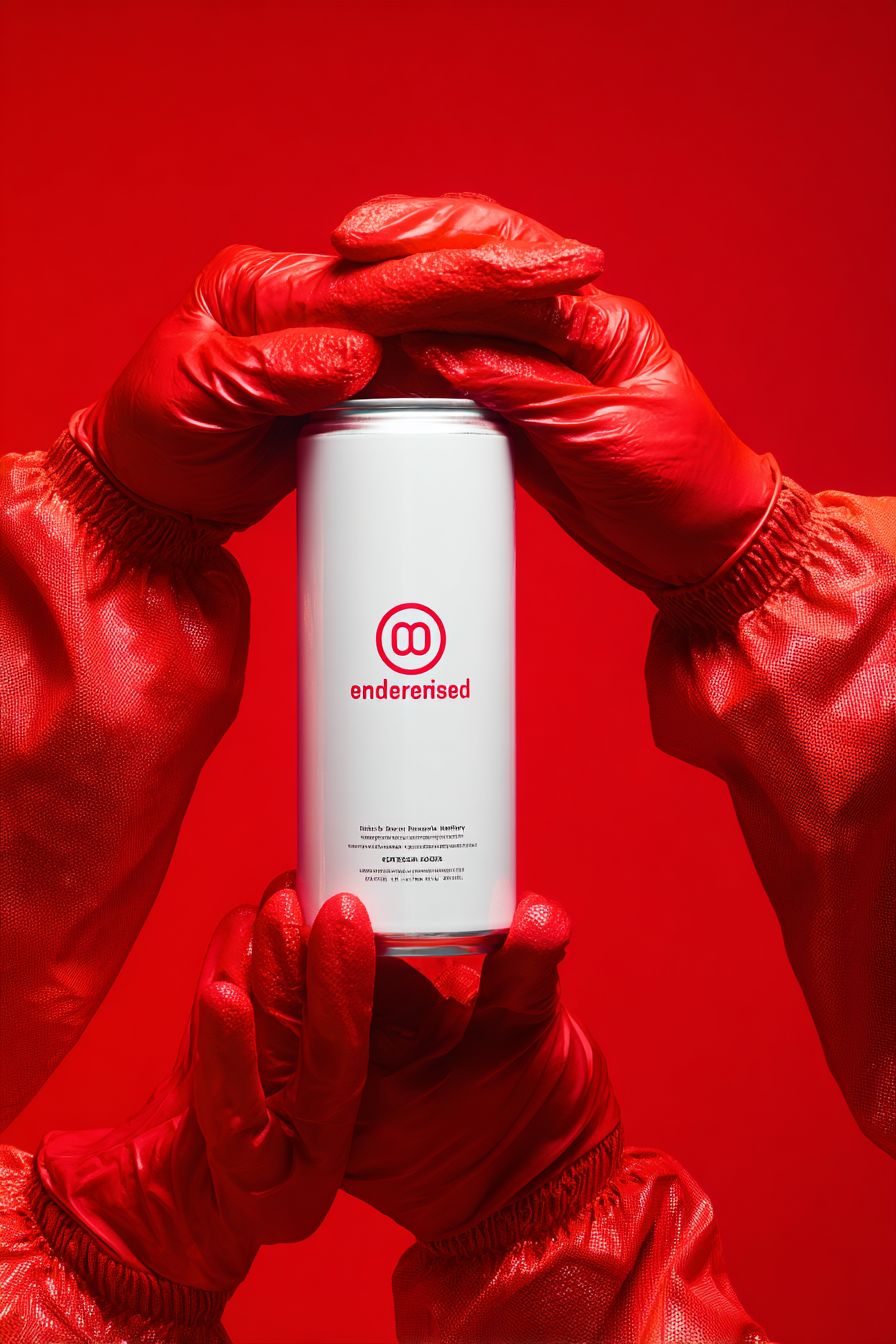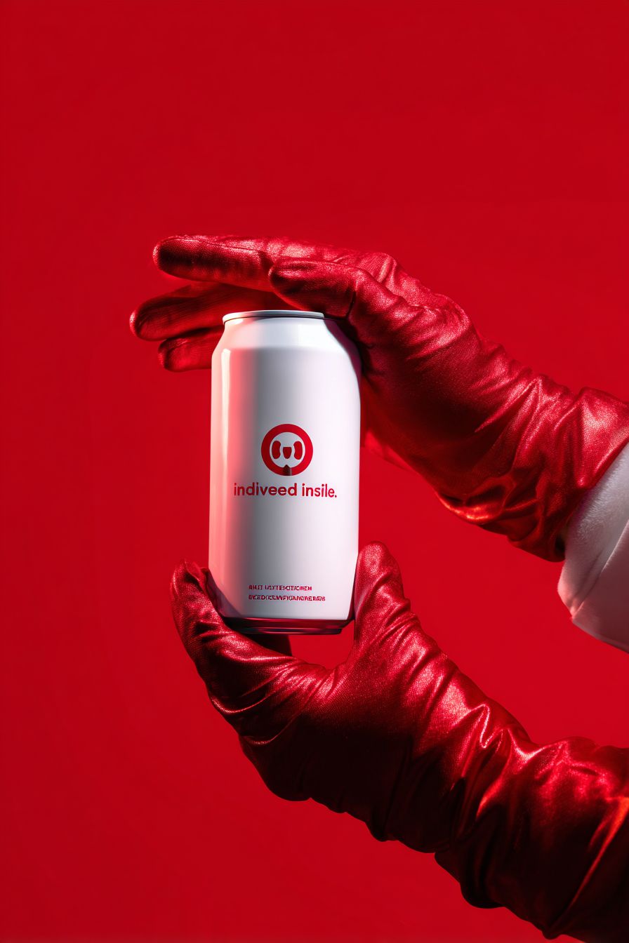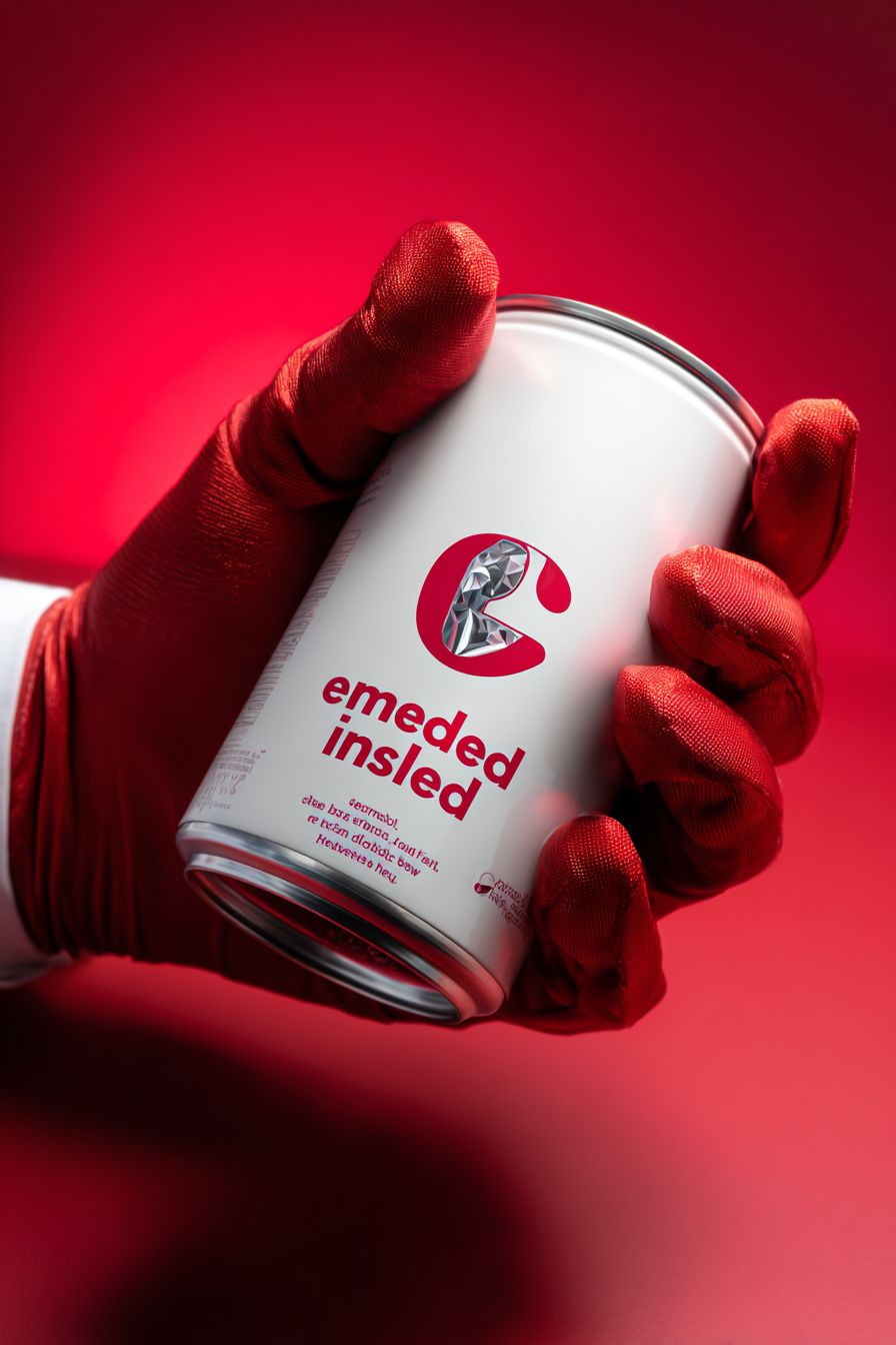 product photography: a white can with an "embedded inside the c" logo is held in red gloves against a solid color background. the subject is photographed in a minimalist style, with studio lighting, in a close-up, macro shot. the high-resolution, high-detail, high-quality image showcases the product in a clean, simple manner. --ar 85:128 --v 7.0 --p 78soi4x --s 50