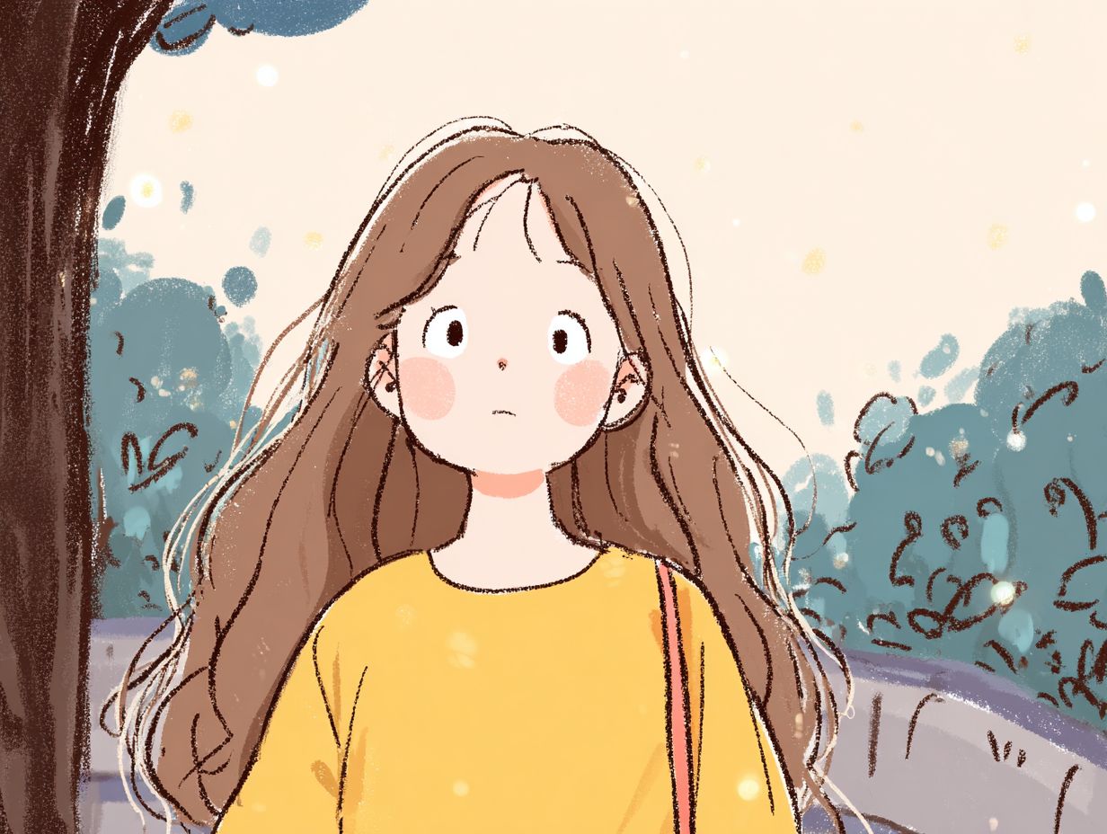 Gentle lighting, soft pastel color palette, 2D illustration, warm and comforting atmosphere. The girl with long brown hair, round eyes, and pink powder blusher, with an ignorant look, wearing a warm yellow blouse, stood in the park.
