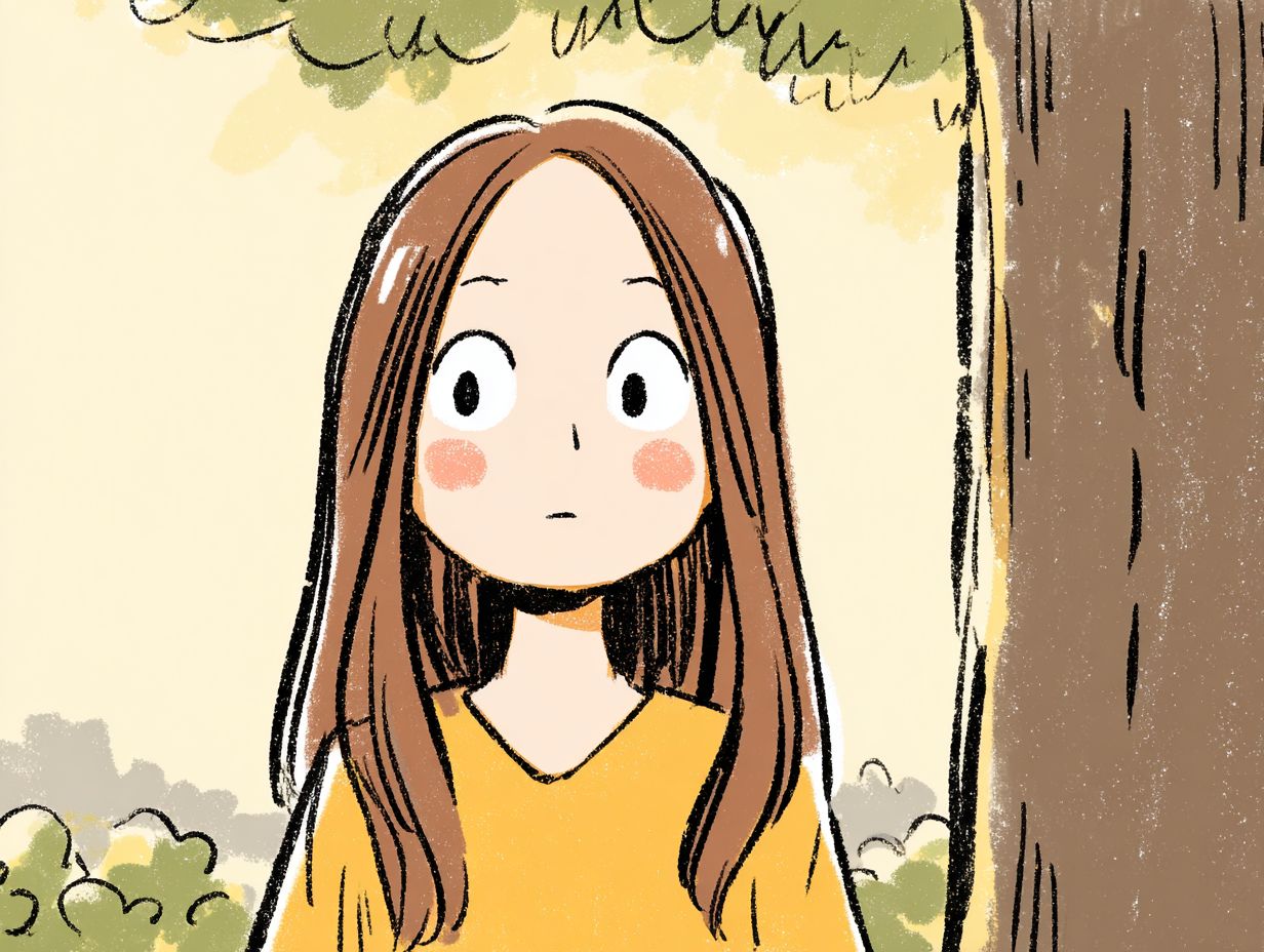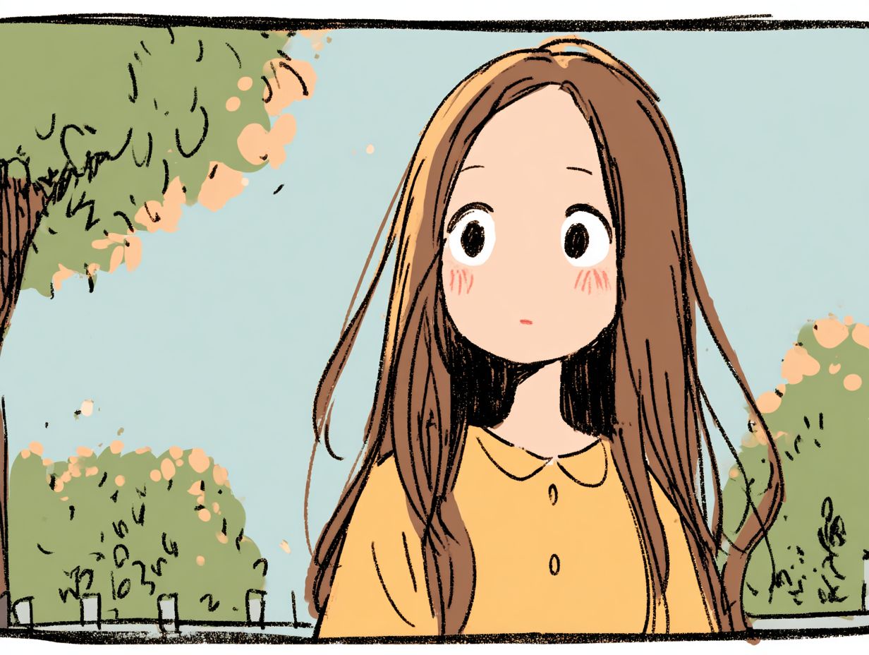 gentle lighting, soft pastel color palette, 2D illustration, warm and comforting atmosphere The girl with long brown hair, round eyes and pink powder blusher, and an ignorant look, wearing a warm yellow blouse, stood in the park --no Black border around --ar 4:3 --profile o7p6oxa --v 7.0 --s 50