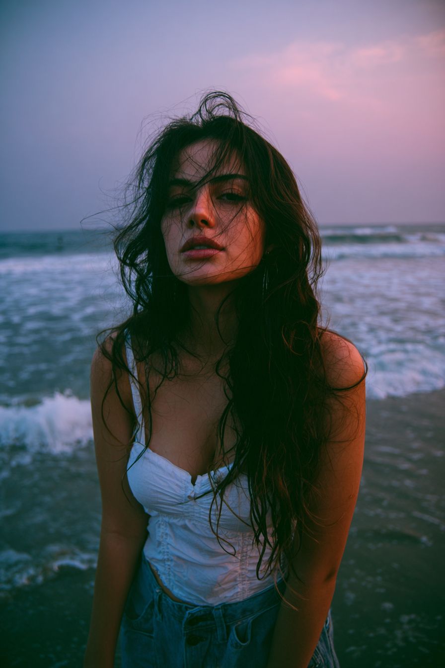 A young woman wearing a white spaghetti-strap top and denim bottoms on the beach at dusk