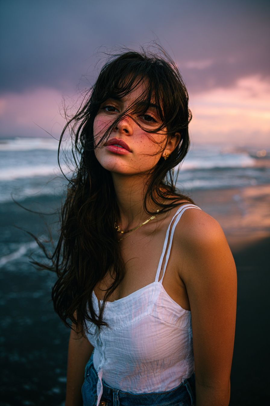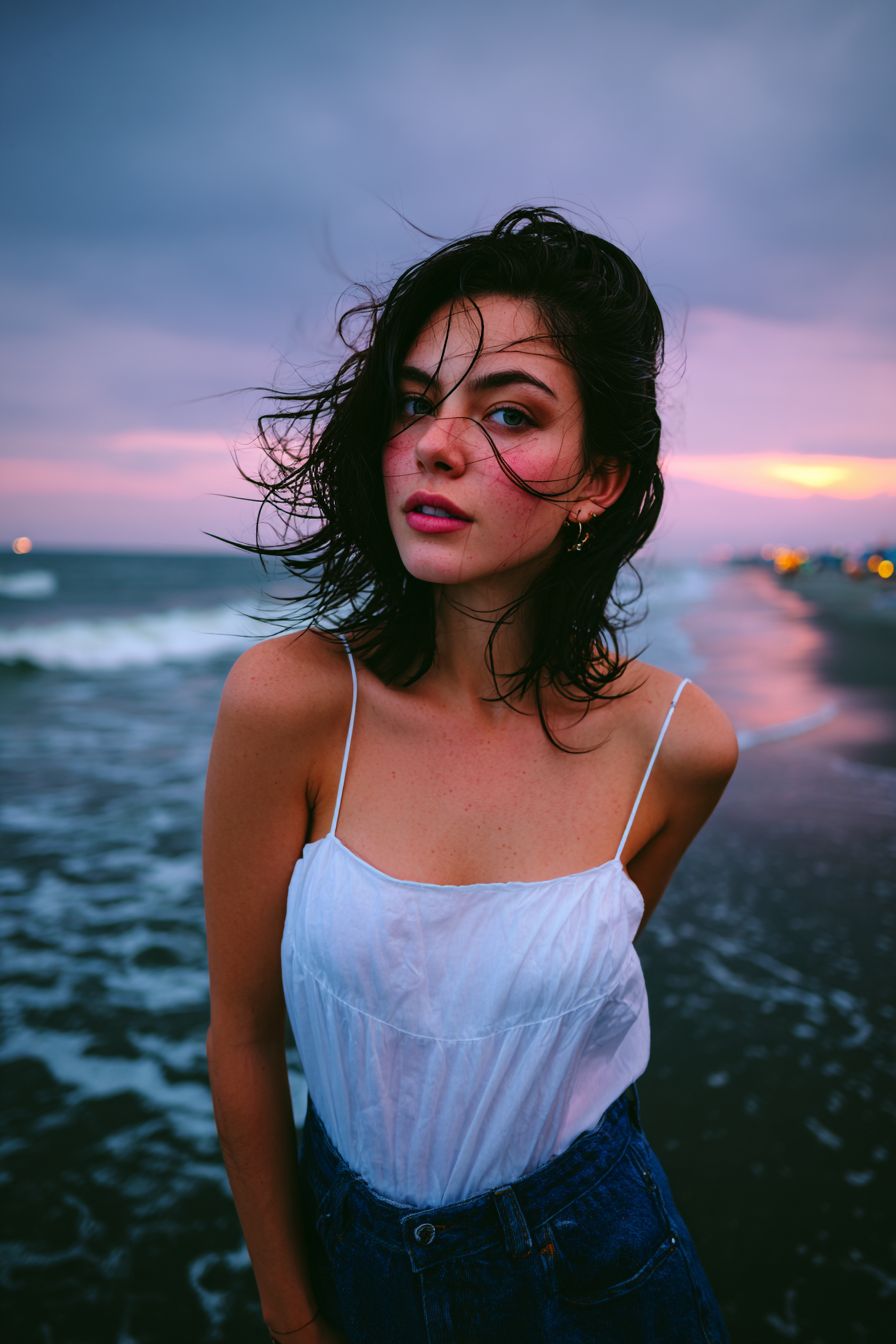 A young woman standing on the beach at dusk, captured in a soft emotional film-style portrait. Her dark hair is messy from the sea breeze, strands blowing across her face. She has natural, slightly flushed skin with a subtle grainy texture. Wearing a white spaghetti-strap top and denim bottoms. The background shows dark ocean waves and a moody sky with soft sunset colors--dusty pink, blue-gray, and muted lavender. The overall image features a low-saturation, cool-toned cinematic film filter with soft contrast, slight grain, and a hazy atmosphere. Close-up portrait, melancholic mood, natural lighting, realistic details, 8K. --ar 2:3 --v 7.0 --p 78soi4x --s 50