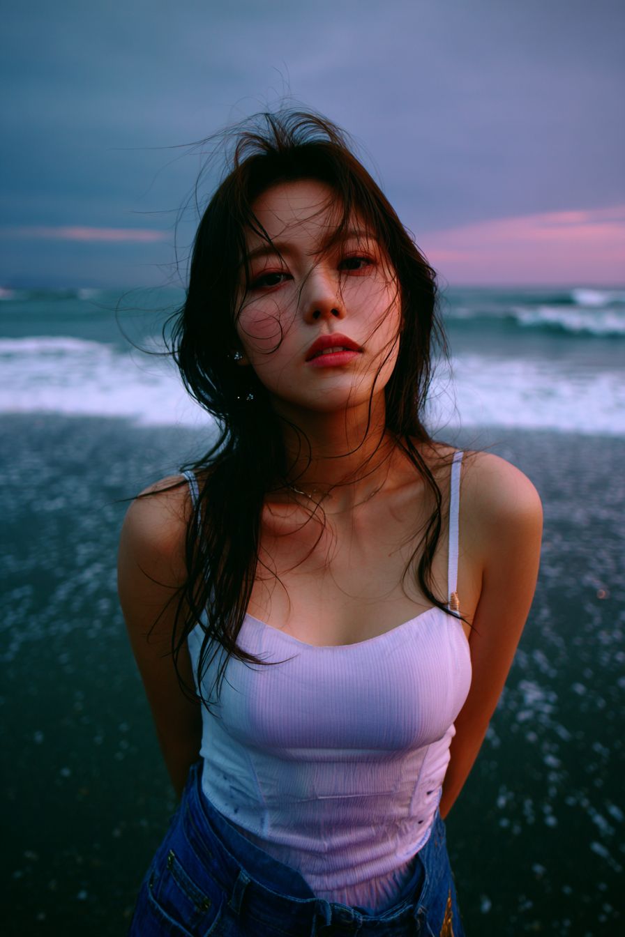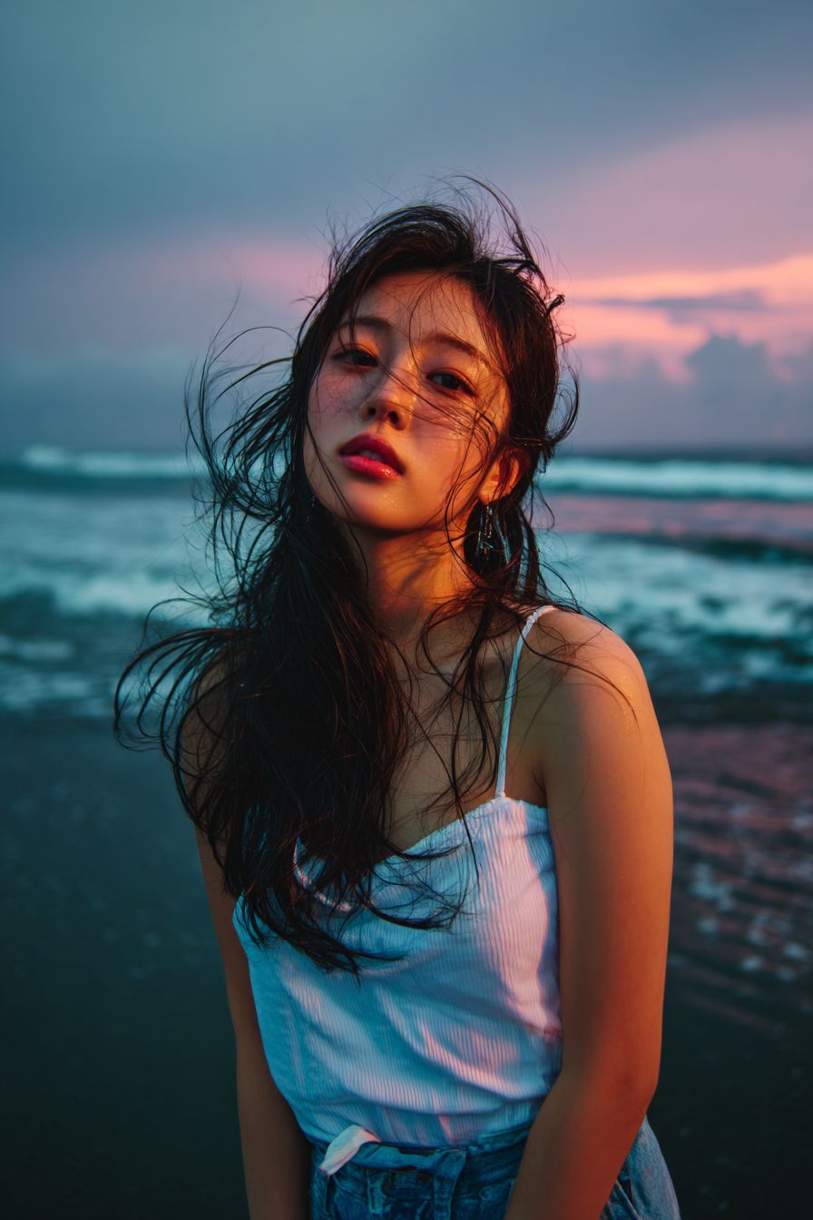 A young k-pop woman on the beach at dusk in an emotional portrait