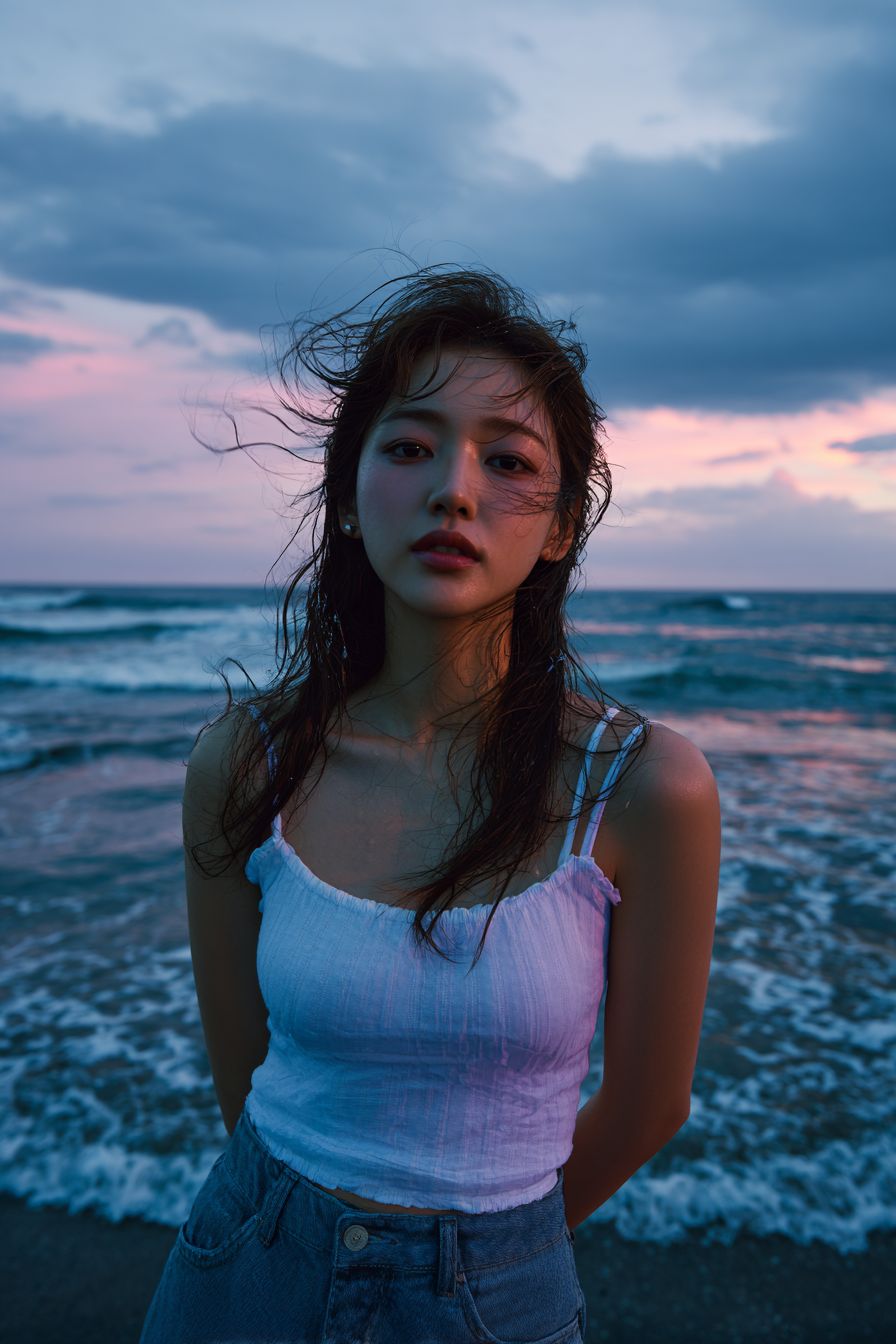 A k-pop young woman standing on the beach at dusk, captured in a soft emotional film-style portrait. Her dark hair is messy from the sea breeze, strands blowing across her face. She has natural, slightly flushed skin with a subtle grainy texture. Wearing a white spaghetti-strap top and denim bottoms. The background shows dark ocean waves and a moody sky with soft sunset colors--dusty pink, blue-gray, and muted lavender. The overall image features a low-saturation, cool-toned cinematic film filter with soft contrast, slight grain, and a hazy atmosphere. Close-up portrait, melancholic mood, natural lighting, realistic details, 8K. --ar 2:3 --v 7.0 --p 78soi4x --s 50