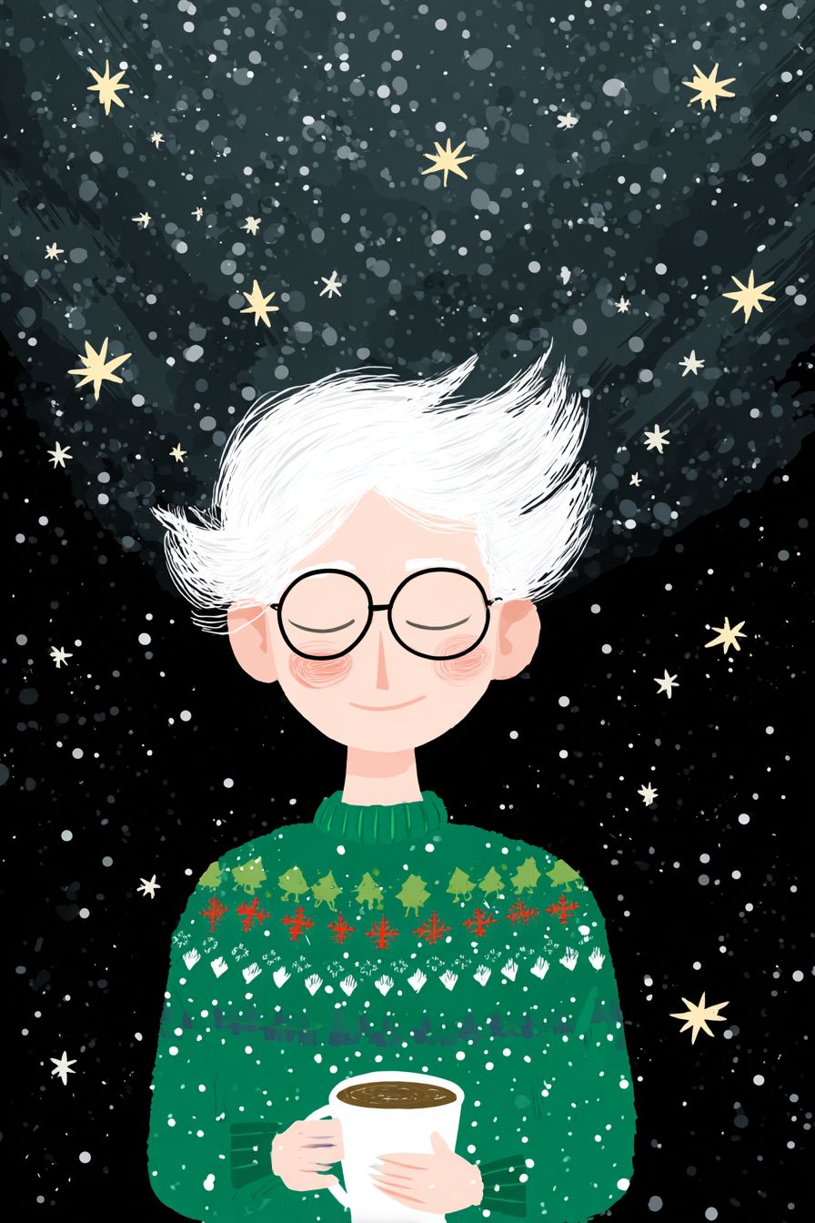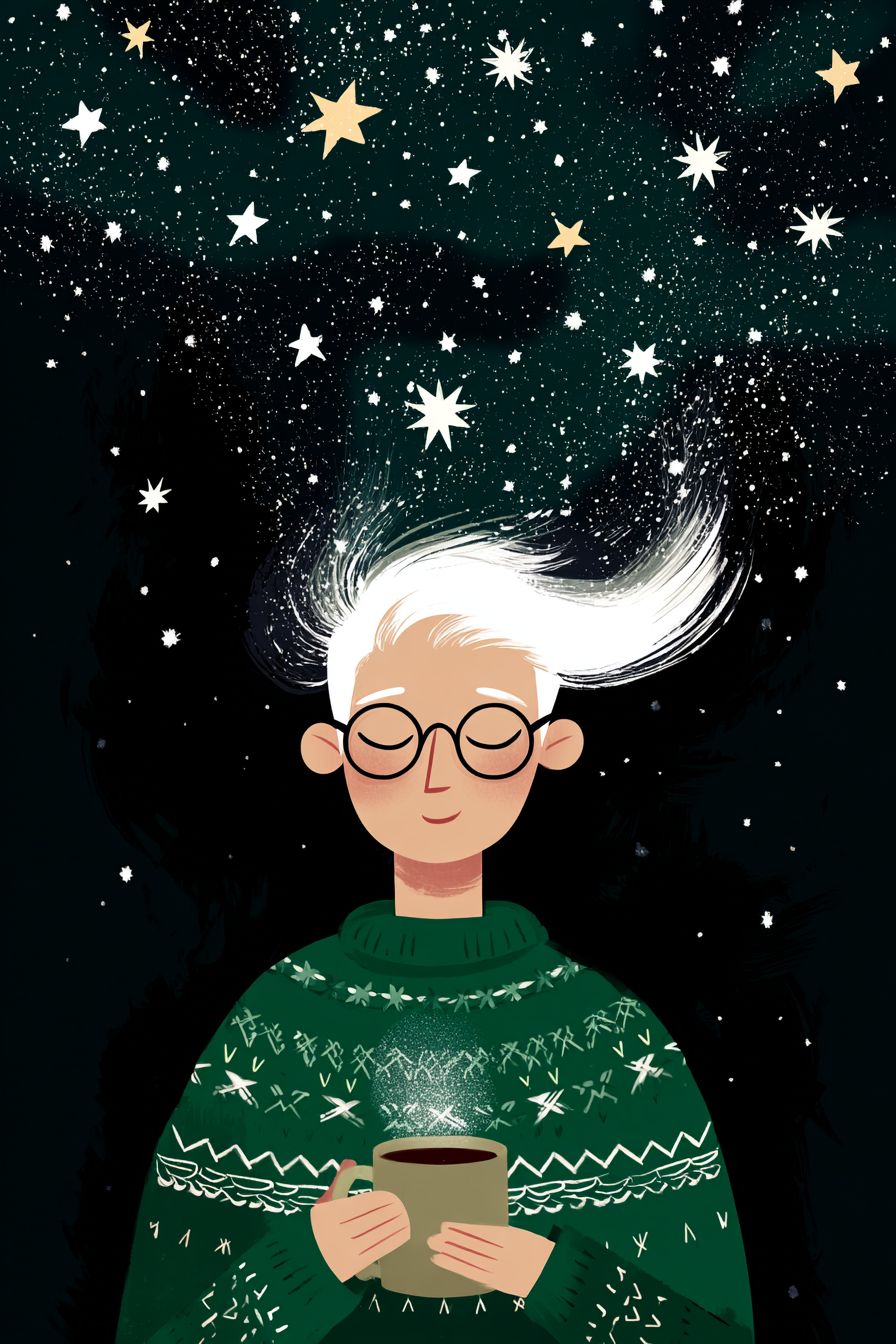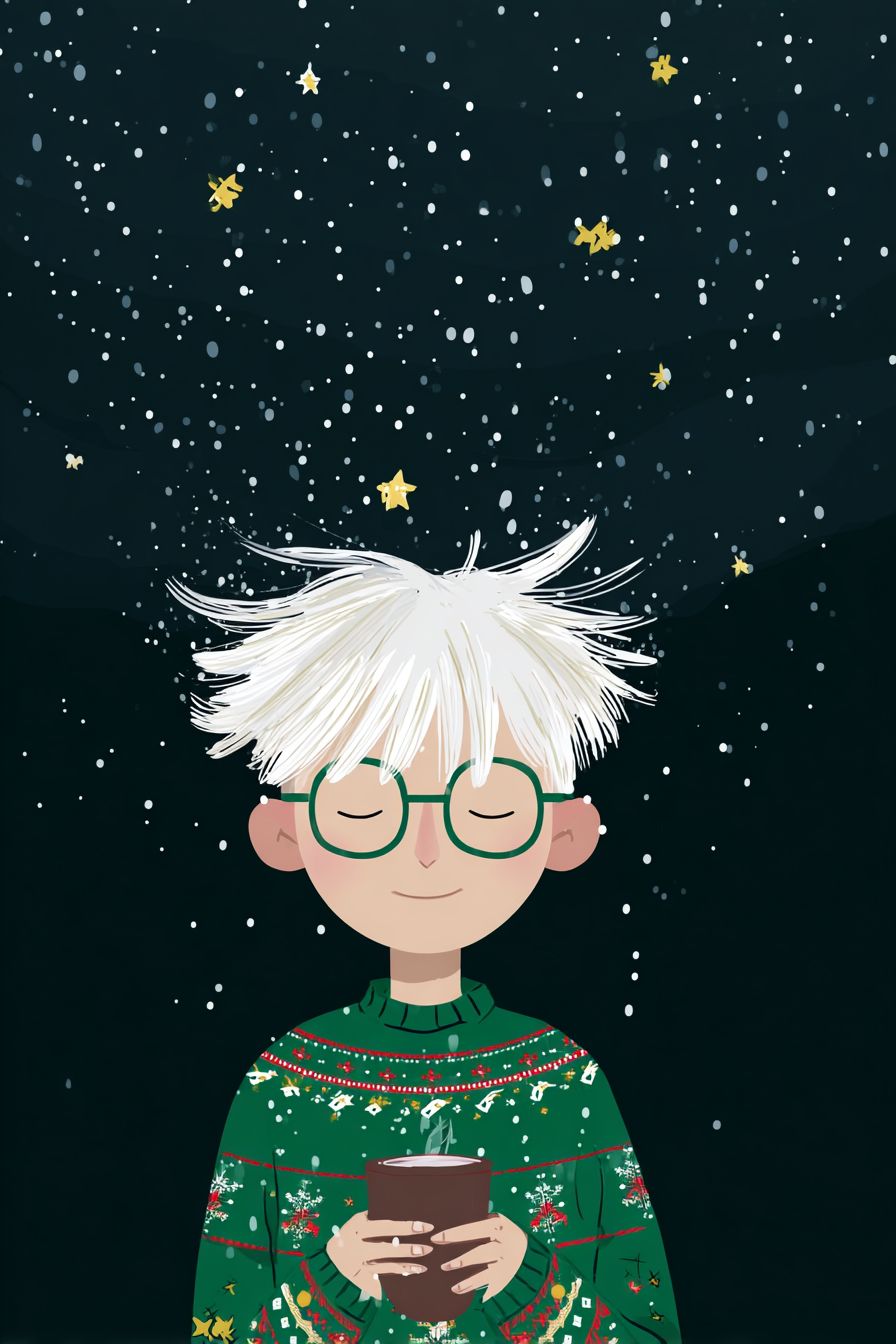 A simple, flat, Christmas-themed illustration of a boy with short white hair and glasses. He has his eyes closed and a relaxed smile, holding a cup of coffee. His hair flows upwards, blending with the starry winter night sky, and the scene is filled with soft falling snowflakes. The background is dark, and he is wearing a green Christmas sweater with a festive pattern.