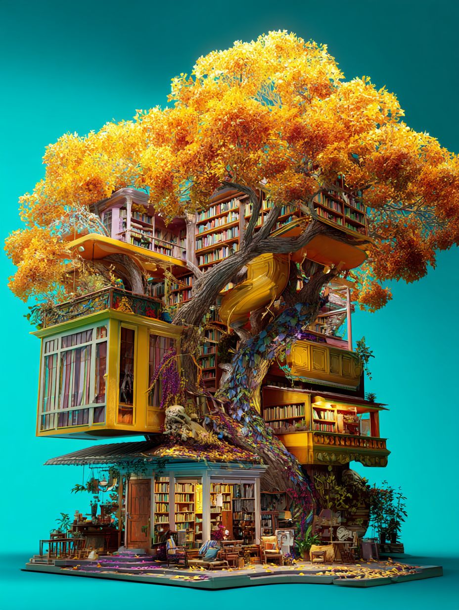 a bookshop in the shape of an old tree, with a yellow and orange color scheme, set against a turquoise background. a detailed, highly realistic, and colorful digital illustration in the style of studio ghibli, with a fantasy-inspired, 3d aesthetic,C4D --ar 3:4 --v 7.0 --p 78soi4x --s 50