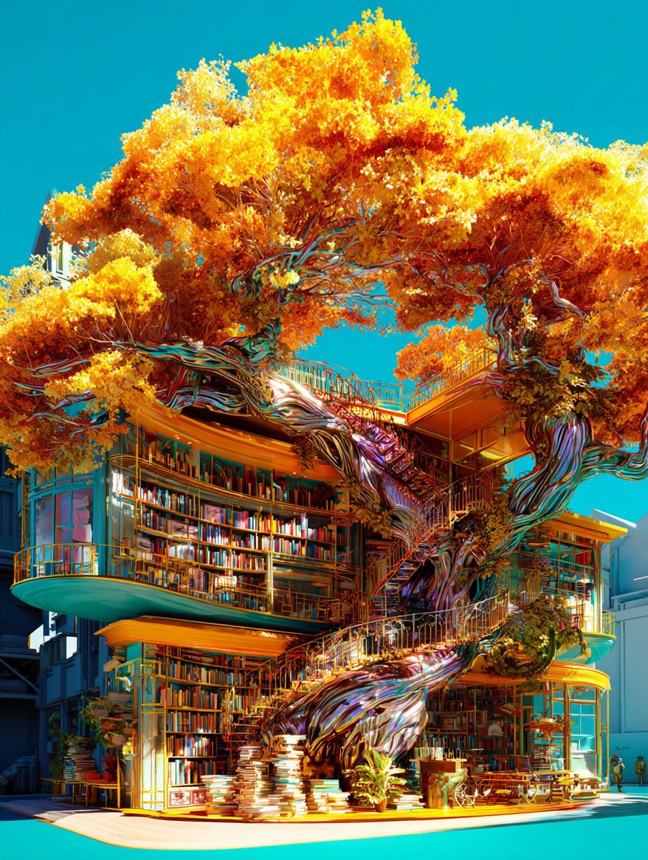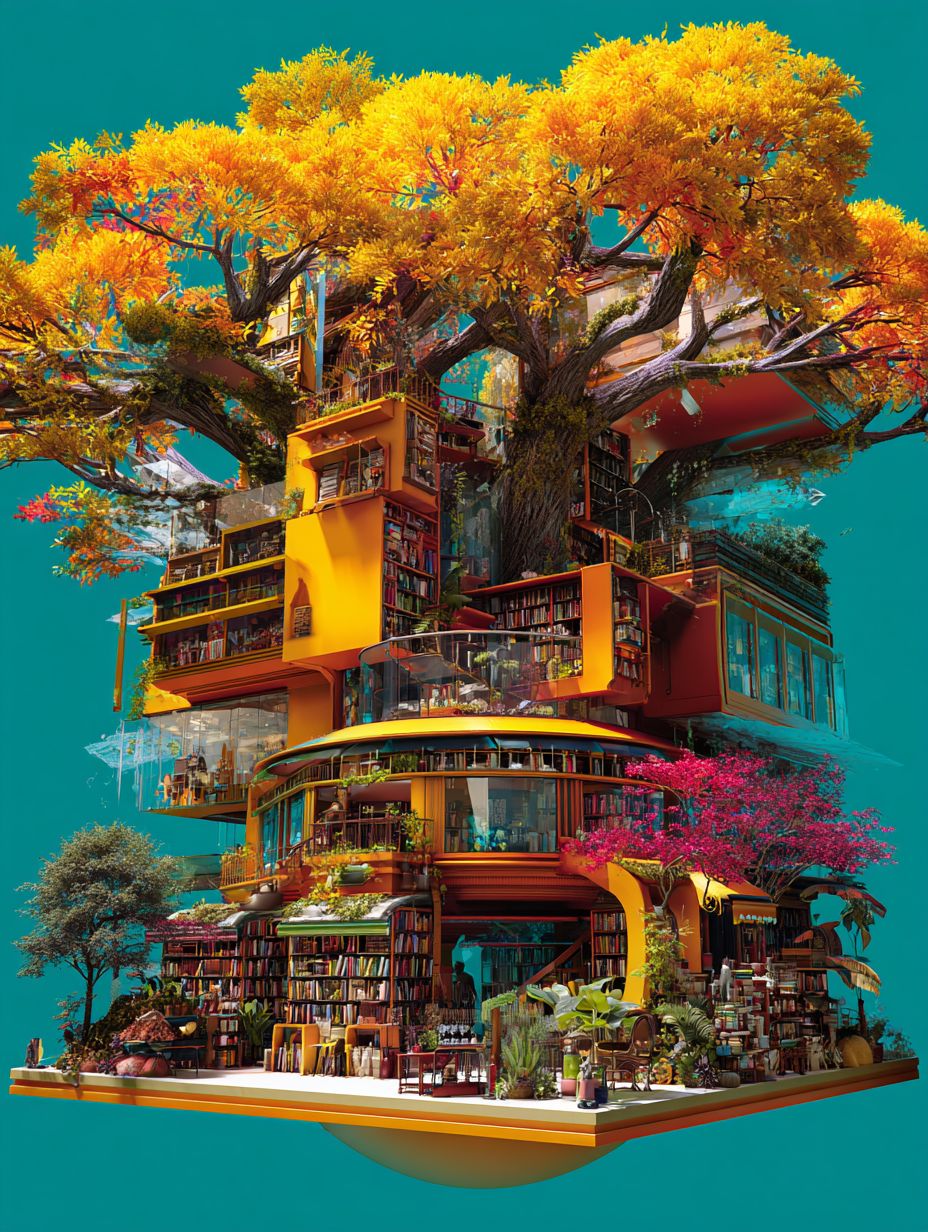 A bookshop shaped like an old tree with a yellow and orange color scheme against a turquoise background