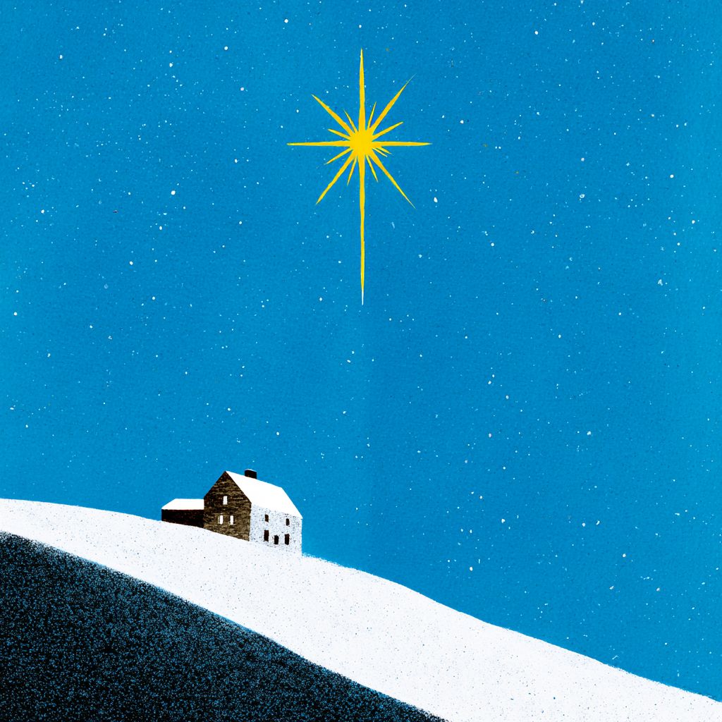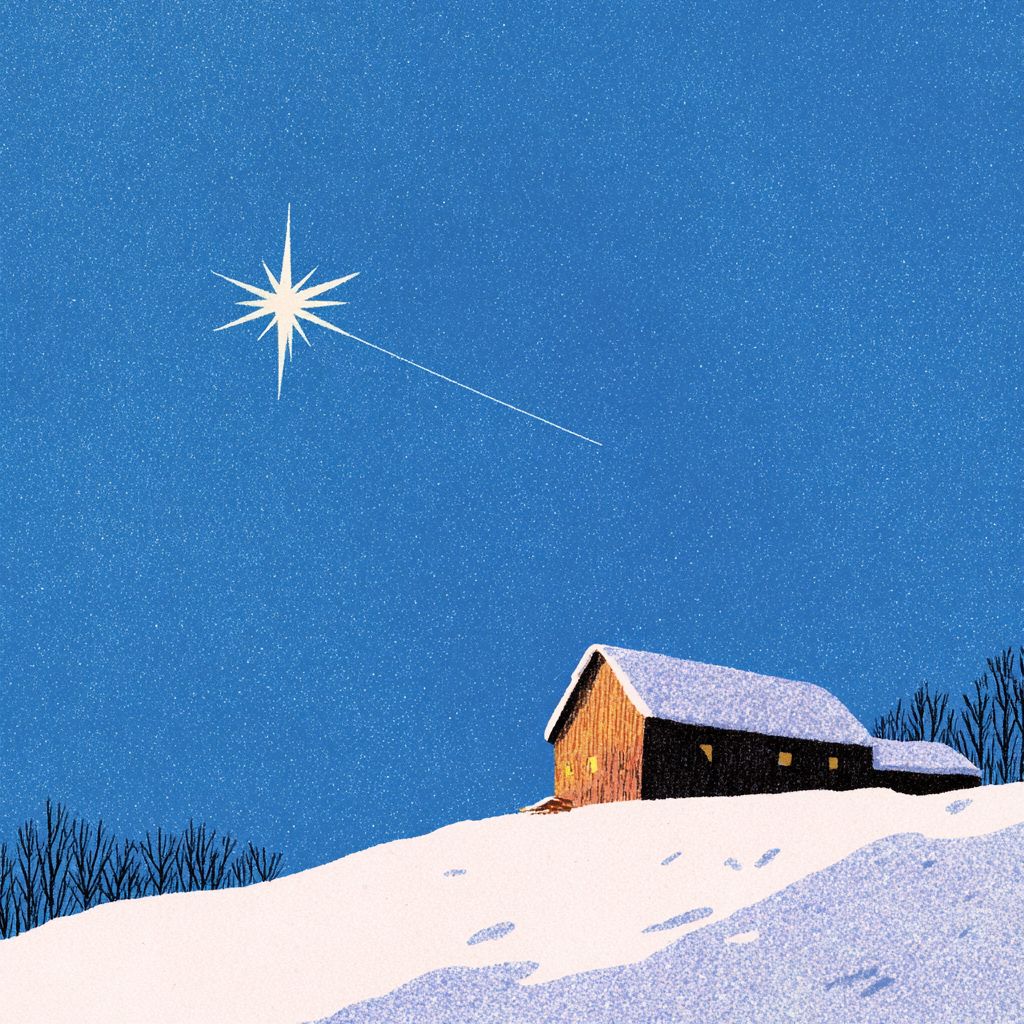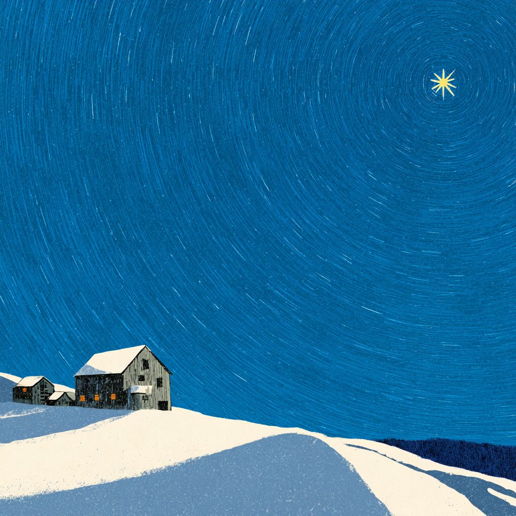 Illustration of the North Star in the sky with a barn and house on a snowy hillside