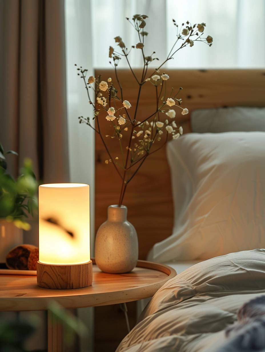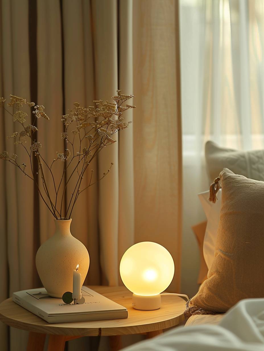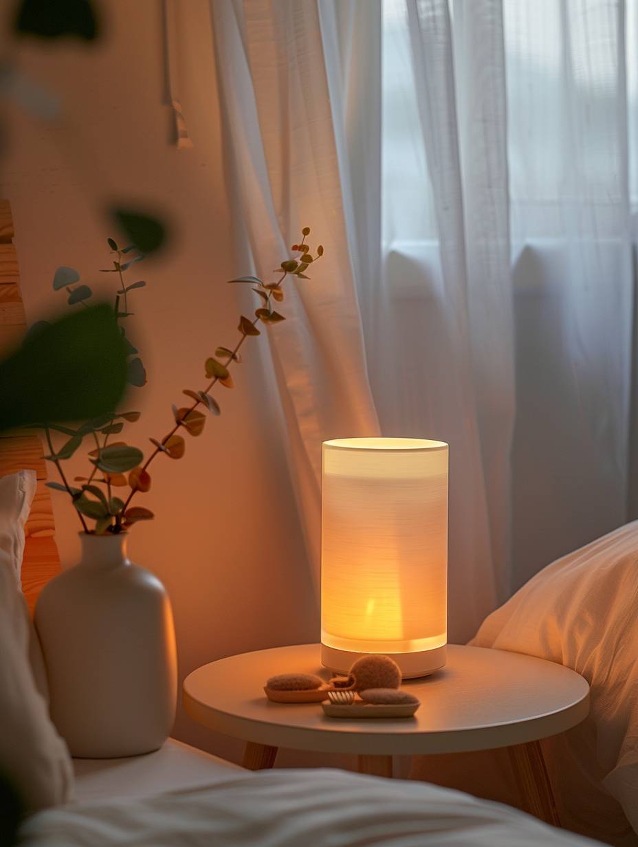 A small stand light design, placed on the side table of a bedroom, with a white bedroom background and a subtle glow from the light. The product design has the light centered in the frame, resulting in a realistic image, 200mm f/2.8, 32k UHD.