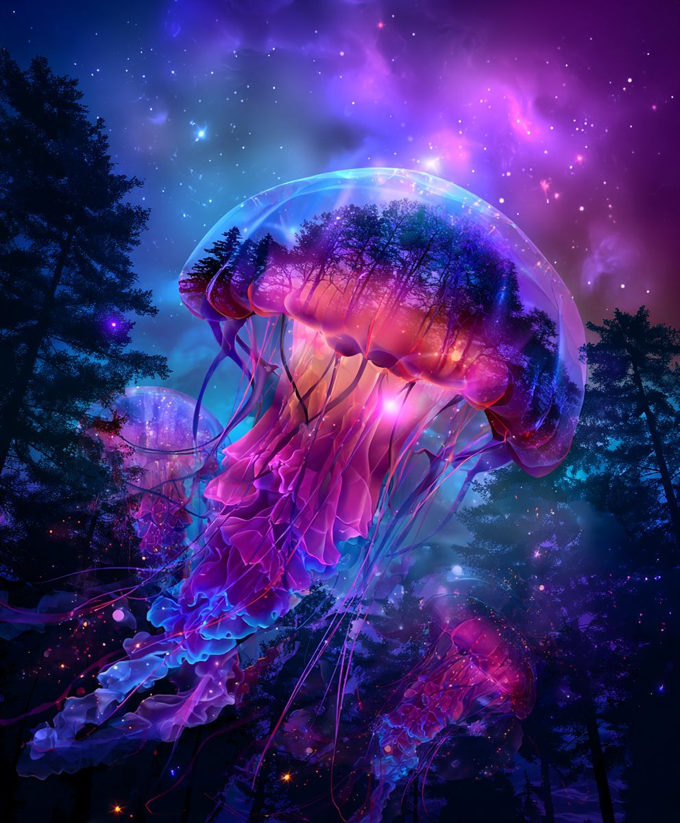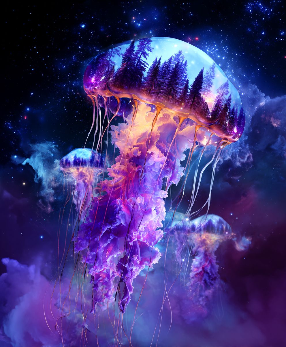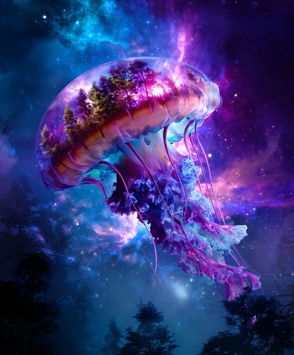 A giant jellyfish floats across a colorful blue and purple nebula, its head resembling a glass sphere showcasing a miniature woods landscape while its long tails blend with the background nebula and stars