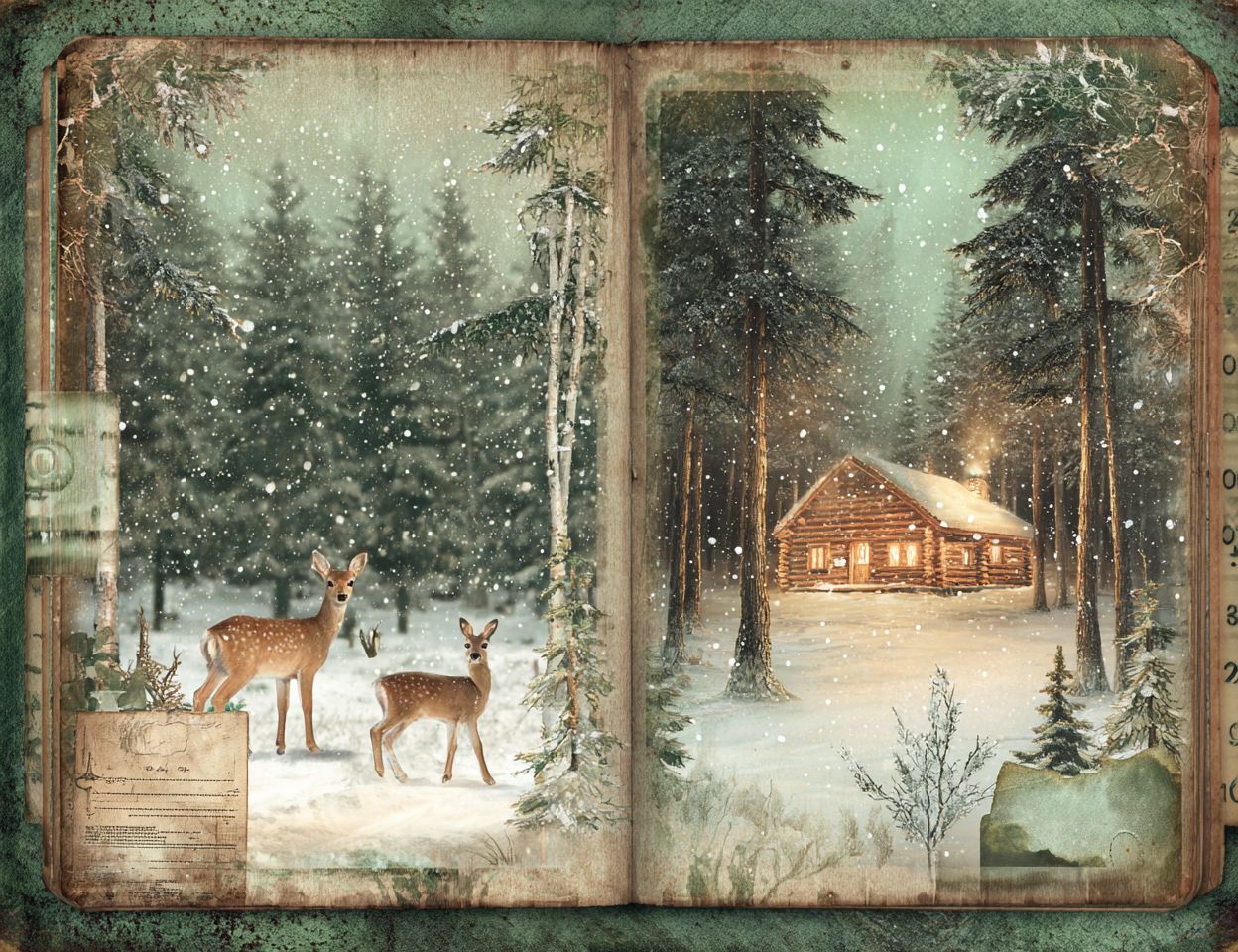 Cozy winter cabin and woodland vintage illustration junk journal spread, letter-size ratio 22:17, deep forest green and white palette with warm browns. Left page: a large central vintage illustration of a deer and a rabbit standing in a snowy forest clearing with tall pines behind them. Right page: a large central vintage illustration of a log cabin in the woods at twilight, warm light glowing from the windows, soft snow falling. Background on both pages has subtle wood grain and faint snowy trees blending into the paper. Around the lower corners of each illustration, only 1-2 small ephemera pieces: a forest map ticket, an old cabin label or wood slice seal, aged paper texture, storybook charm.