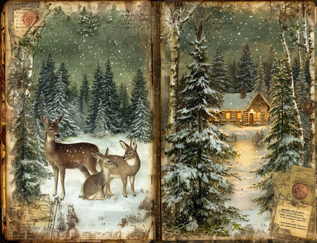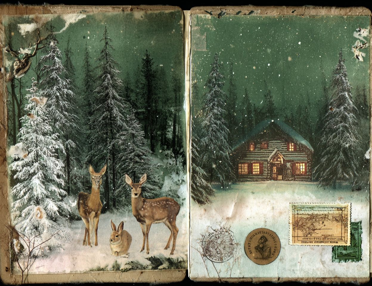 Cozy winter cabin and woodland vintage illustration junk journal spread