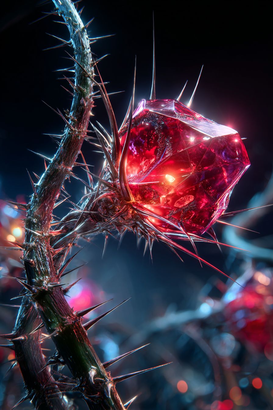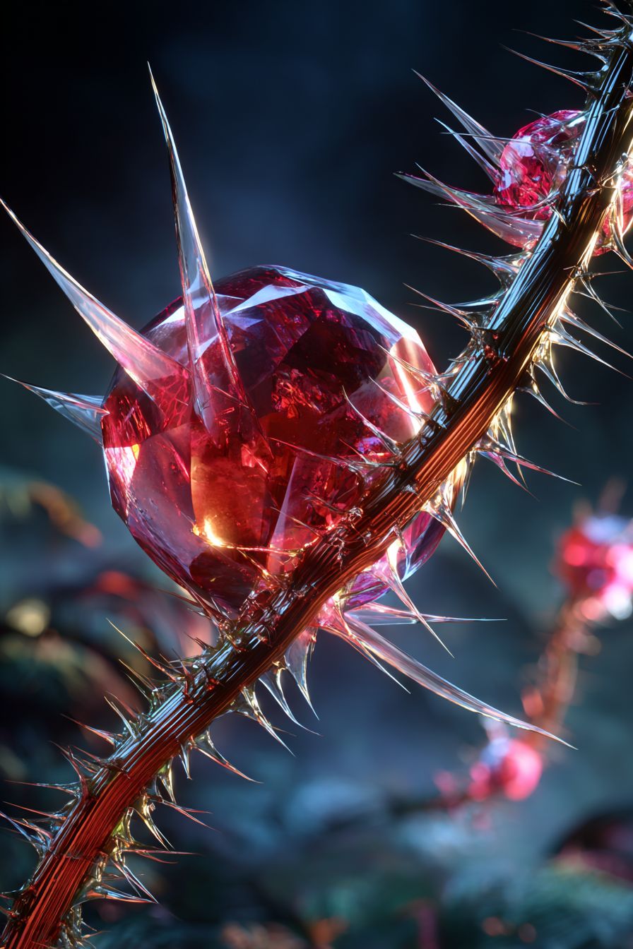 a red gemstone with a ruby-like texture is wrapped around the stem of an alien plant, which has long, thin tendrils that end in sharp, thorn-like or fang-like teeth. the background lighting creates a dark atmosphere, emphasizing the details and textures. this close-up shot captures the intricate patterns on the gem's surface and adds depth to the scene. --ar 85:128 --v 7.0 --p 78soi4x --s 50