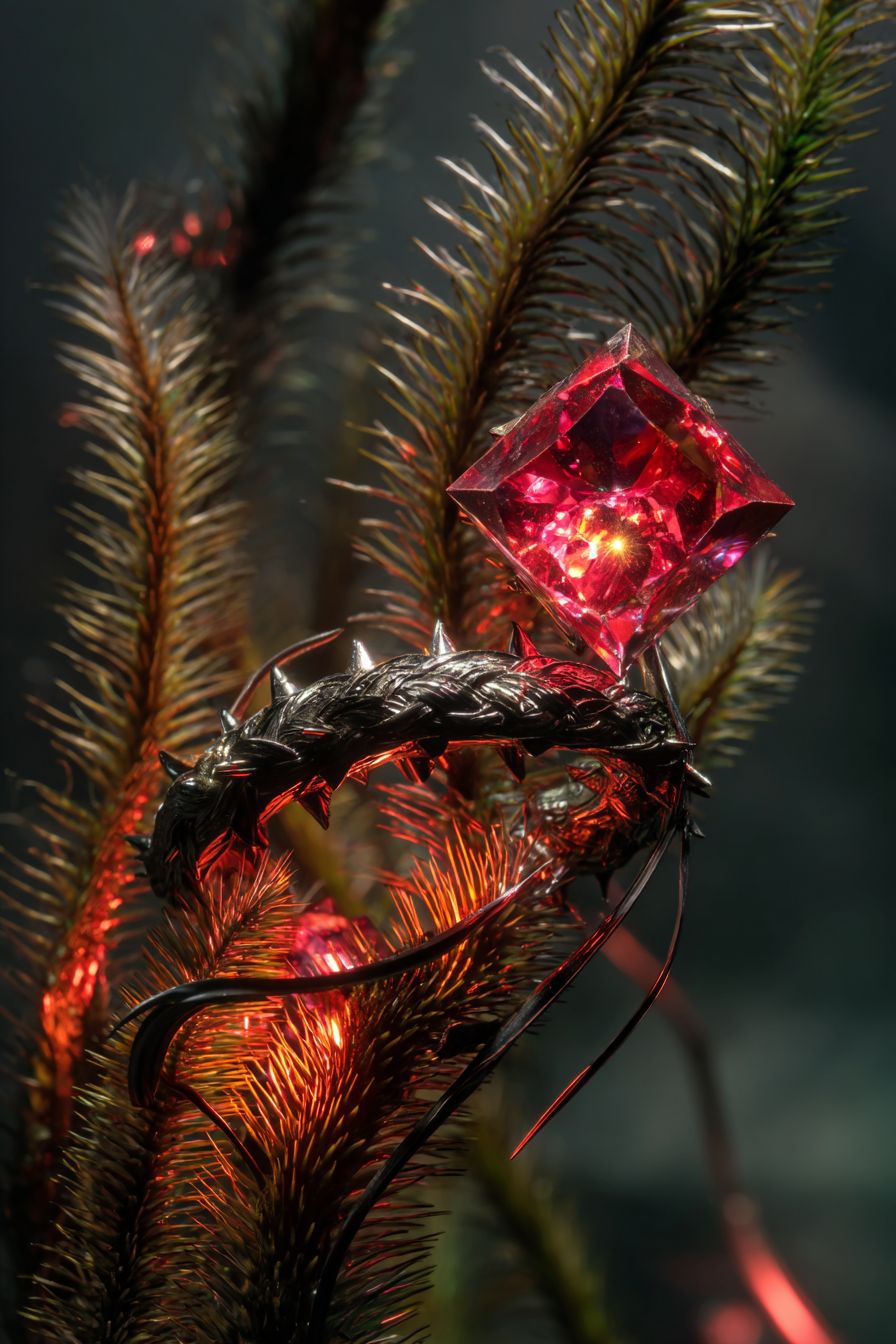 A red gemstone with a ruby-like texture is wrapped around the stem of an alien plant, which has long, thin tendrils that end in sharp, thorn-like or fang-like teeth. The background lighting creates a dark atmosphere, emphasizing the details and textures. This close-up shot captures the intricate patterns on the gem's surface and adds depth to the scene.
