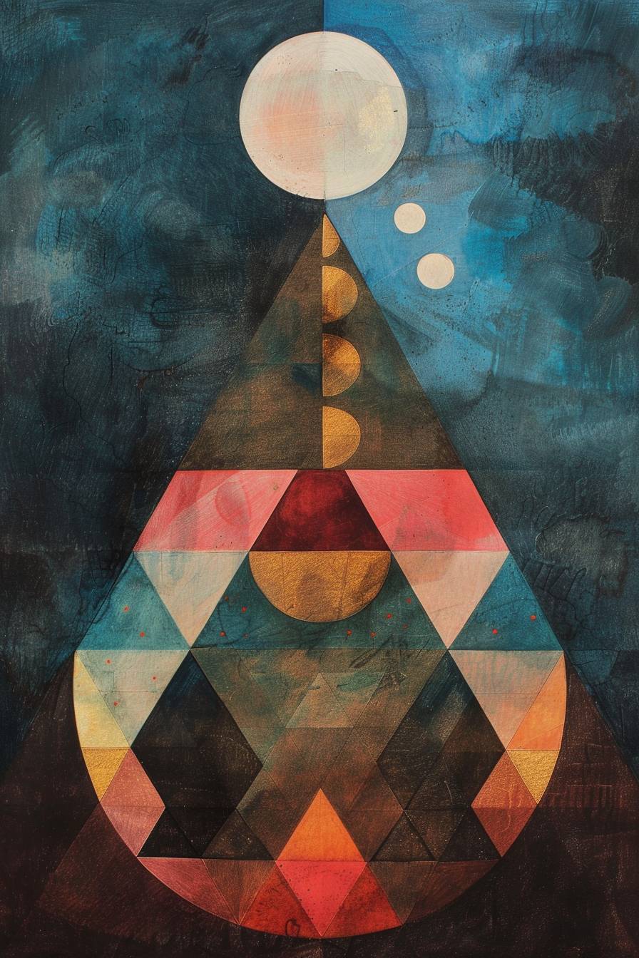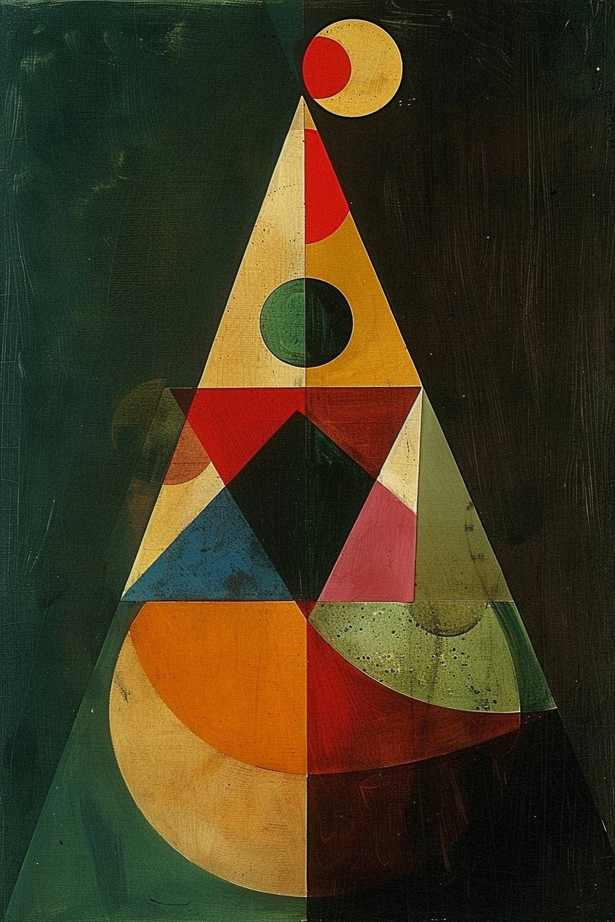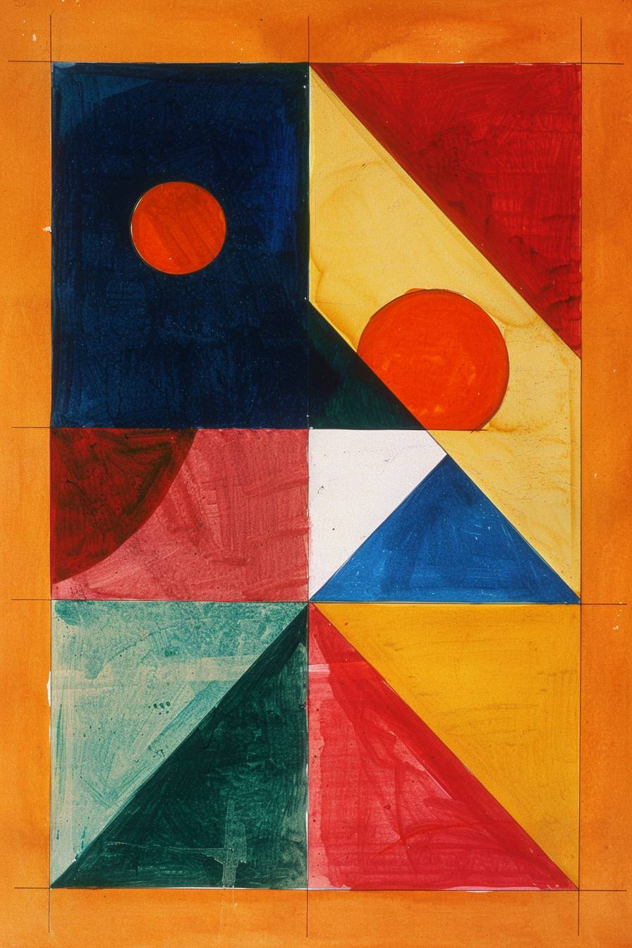Simple aromatic composition consisting of triangles squares and circles and one natural form, in gouache style, Johannes Itten, --ar 2:3 --v 6.0
