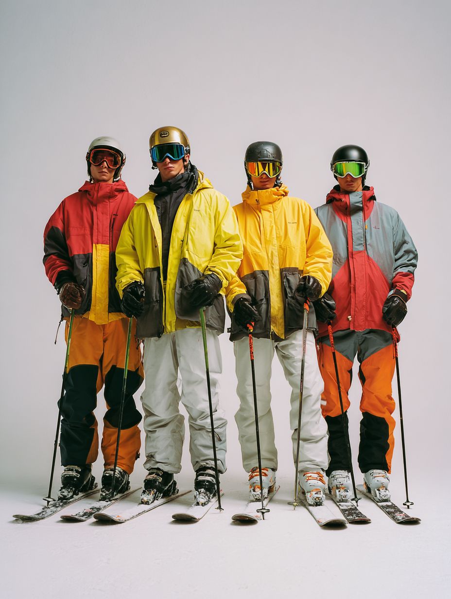 a photo of four male skiers standing side by side, wearing winter jackets, ski pants and gloves, helmets on with ski goggles, each holding ski poles, standing on their skis, studio-style white background, clean minimal look, fashion ski photoshoot vibe, shot from a slightly low angle, full body visible, --ar 3:4 --v 7.0