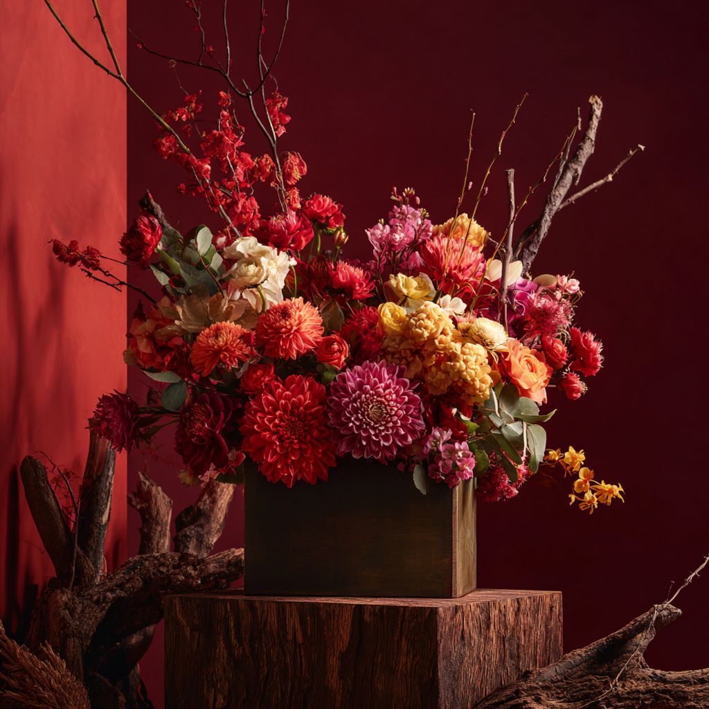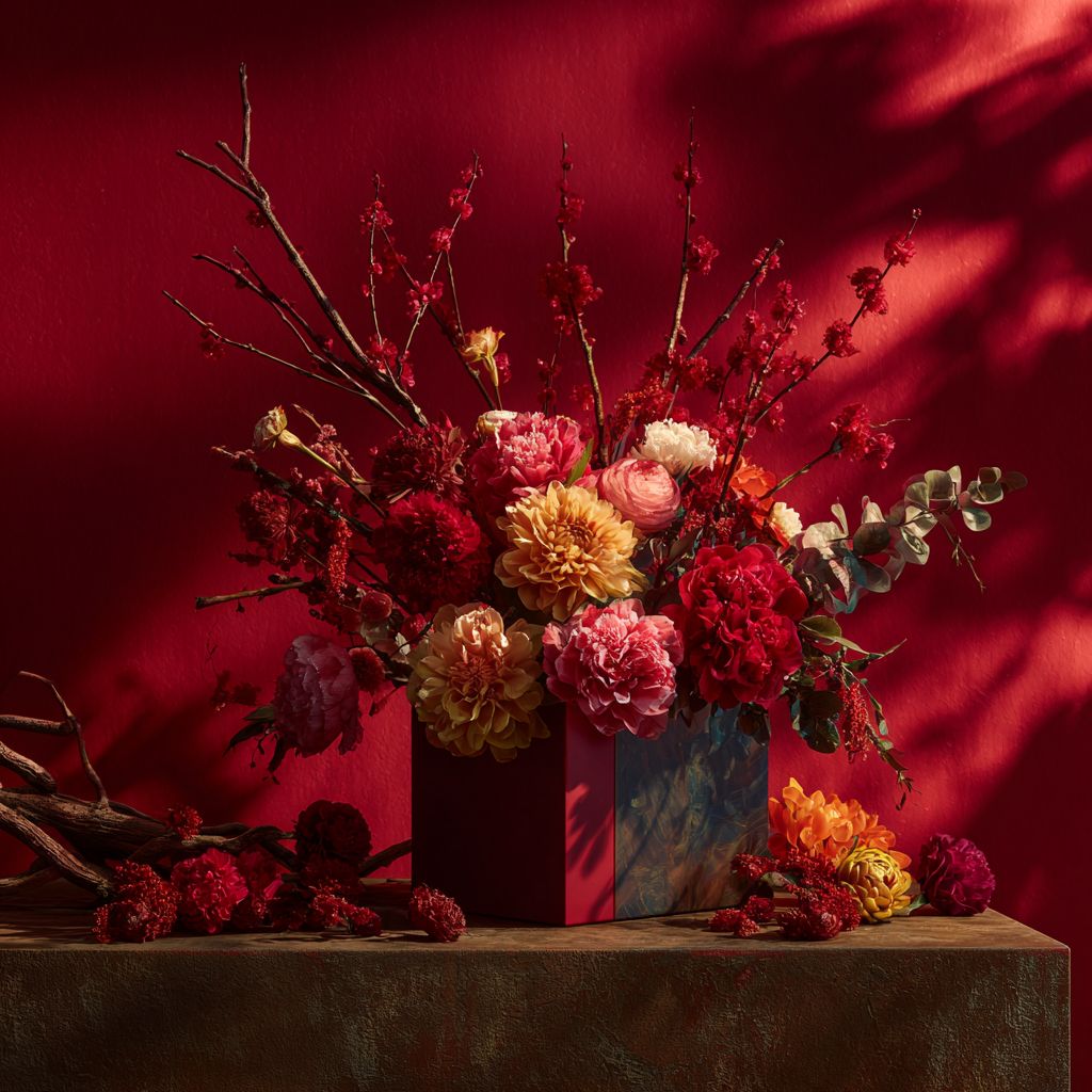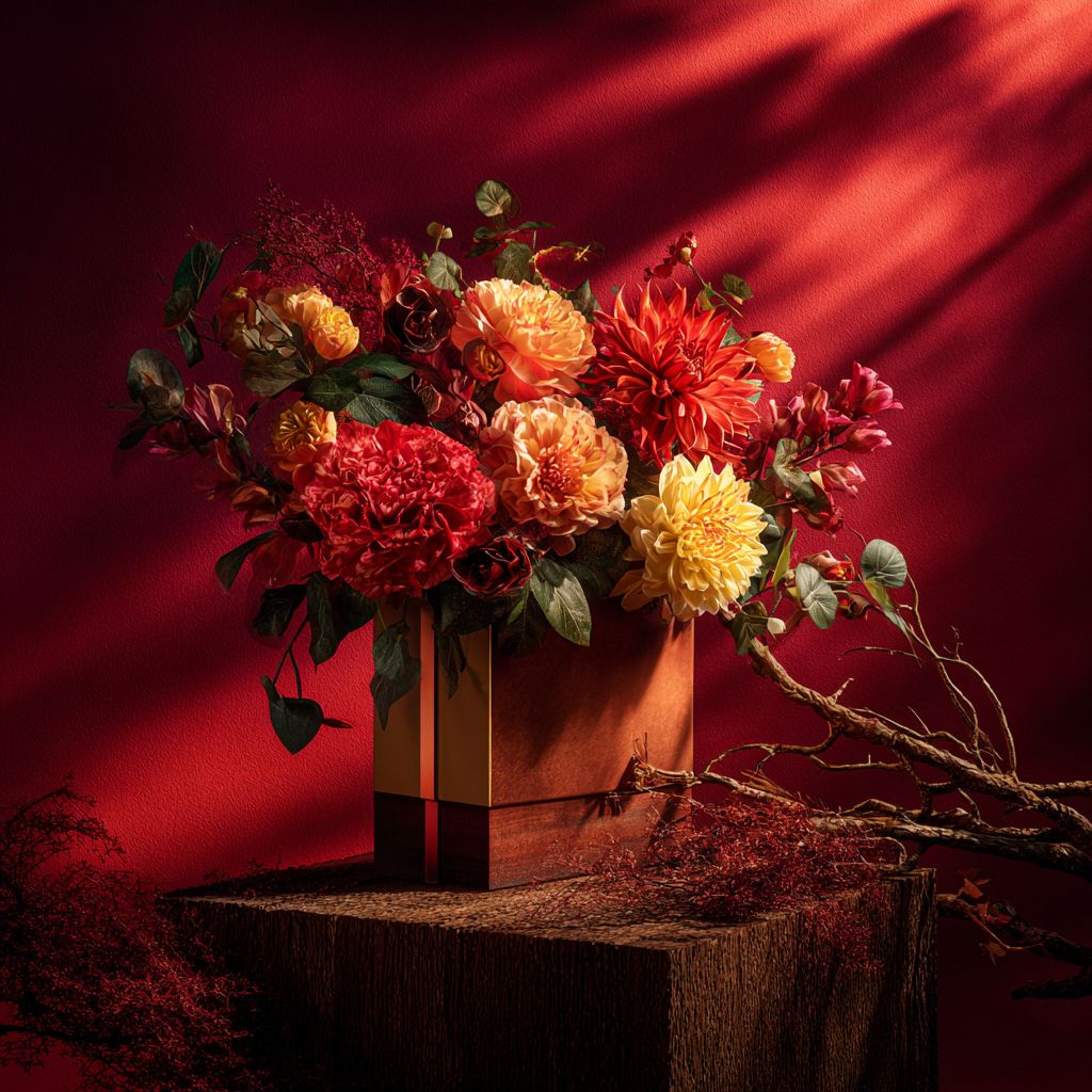 A slightly top down angle of a luxurious Chinese New Year still-life product scene featuring an elegant floral arrangement in a rectangle box, surrounded by vibrant CNY colors. Deep red background with dramatic shadows, cinematic moody lighting, warm highlight glow. slightly top down angle of the floral box on a long wooden pedestal, natural textures like aged wood, branches, and subtle mist for depth. Rich festive colors: gold, red, orange, yellow, and lush greenery. Composition inspired by high-end perfume editorials, refined, minimal, premium luxury branding. Ultra-detailed petals, crisp vase texture, soft spotlight from above, shallow depth of field, 4K photography, studio lighting, editorial still-life style --v 7.0