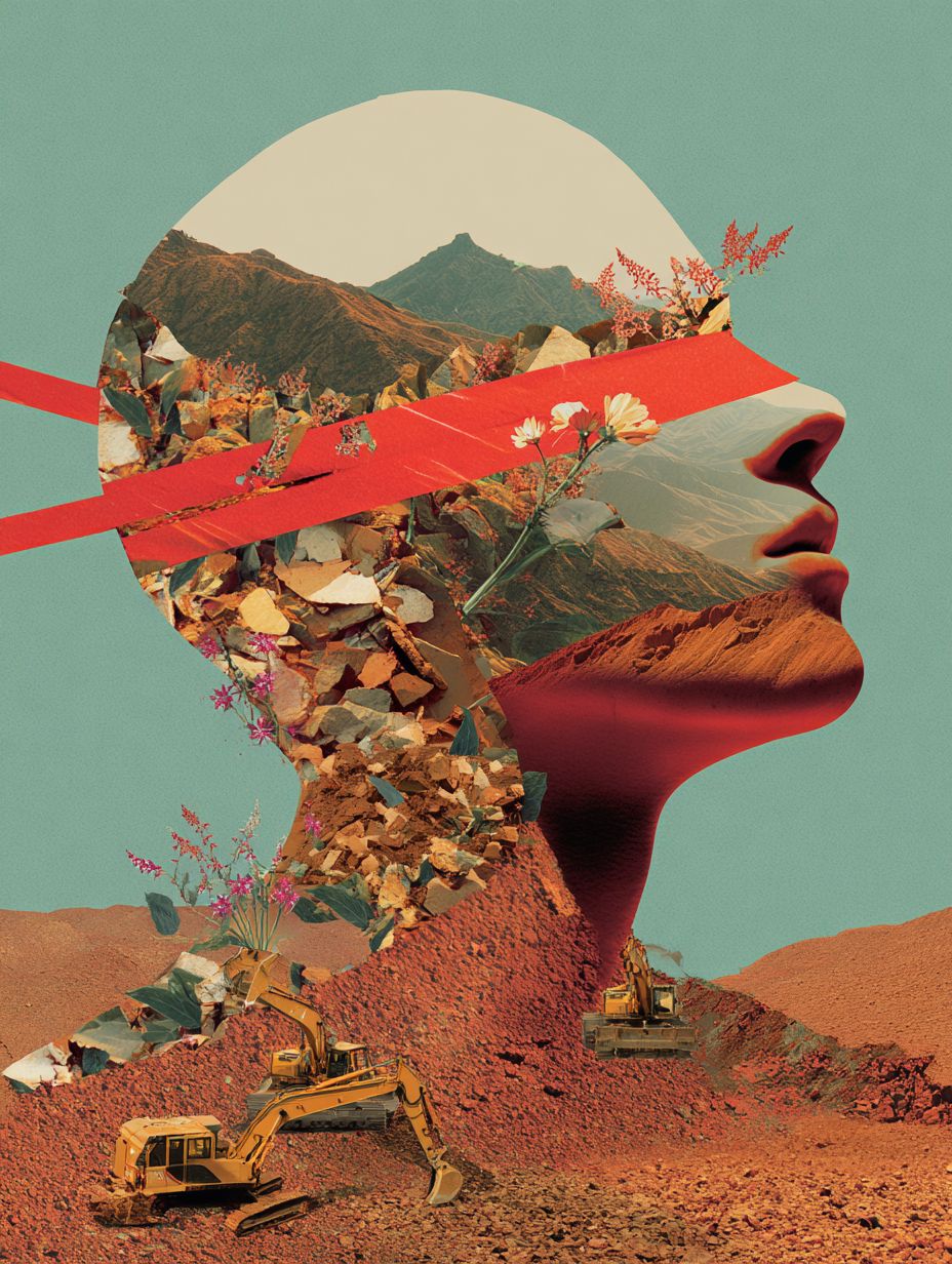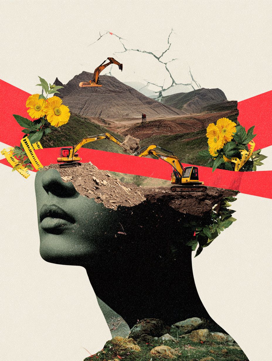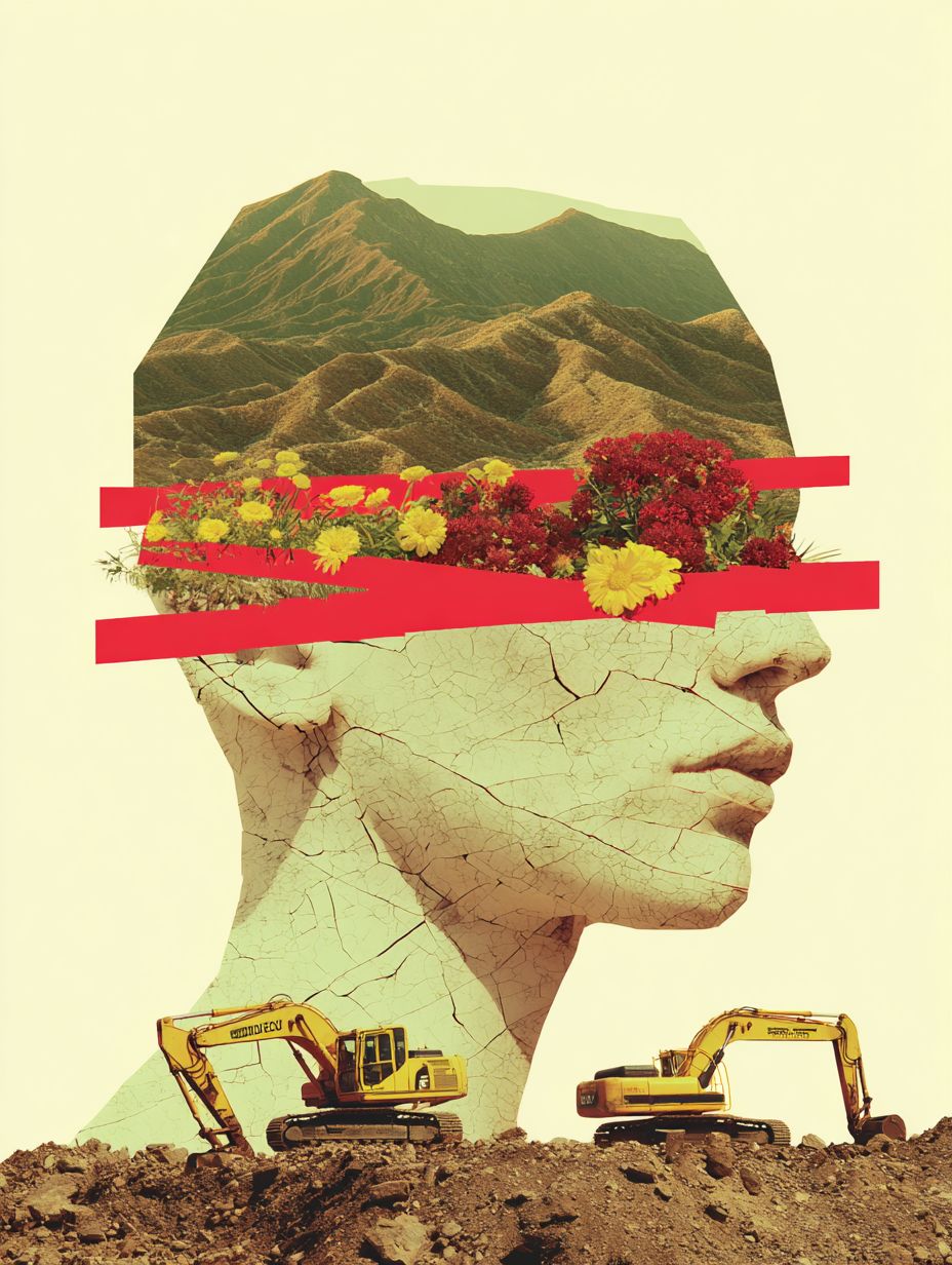 Analog retro collage poster, editorial Swiss graphic design, brutalist composition, cutout surreal collage; Save Aravalli Hills theme; Indian mountain reimagined as a human profile silhouette, Aravalli mountain ridges forming the face; mining machinery, bulldozers, cracked earth slicing through the eyes like visual censorship; protest flowers, dry foliage, warning tape layered into the composition; earthy greens and browns contrasted with harsh reds; political editorial poster aesthetic, strong grid imbalance, high-contrast textures, film grain, minimal typography space, raw activist tone, style raw --ar 3:4 --raw --profile dp872x1 --v 7.0