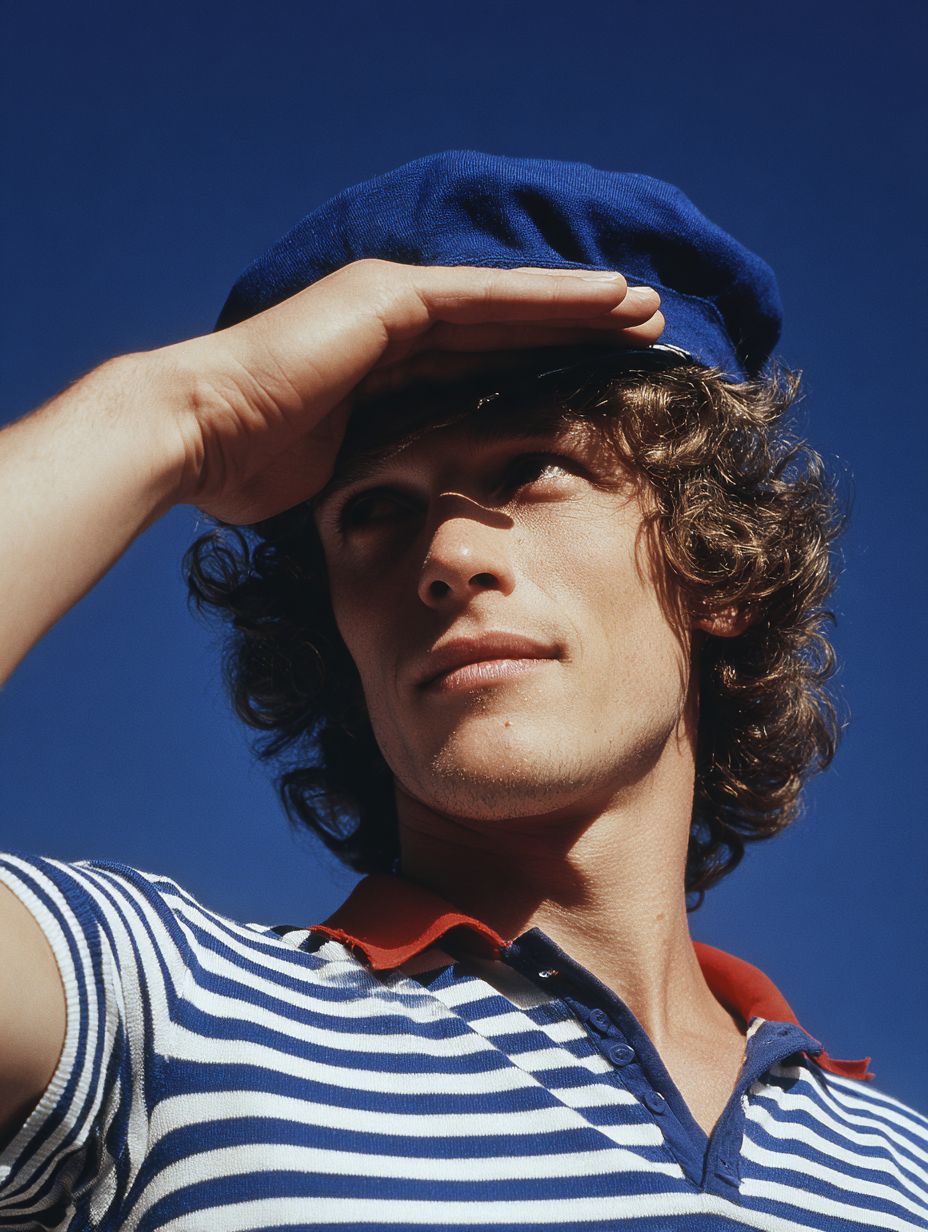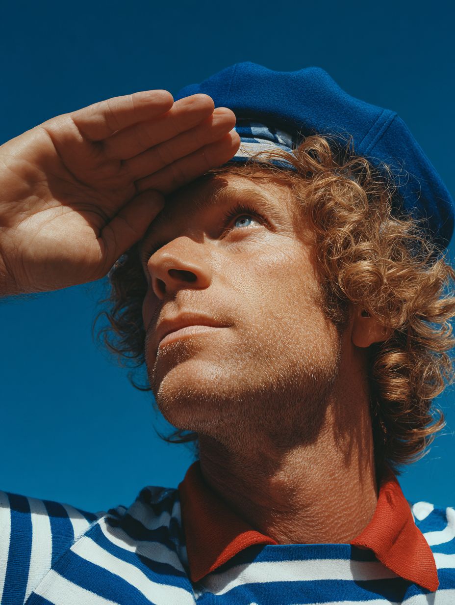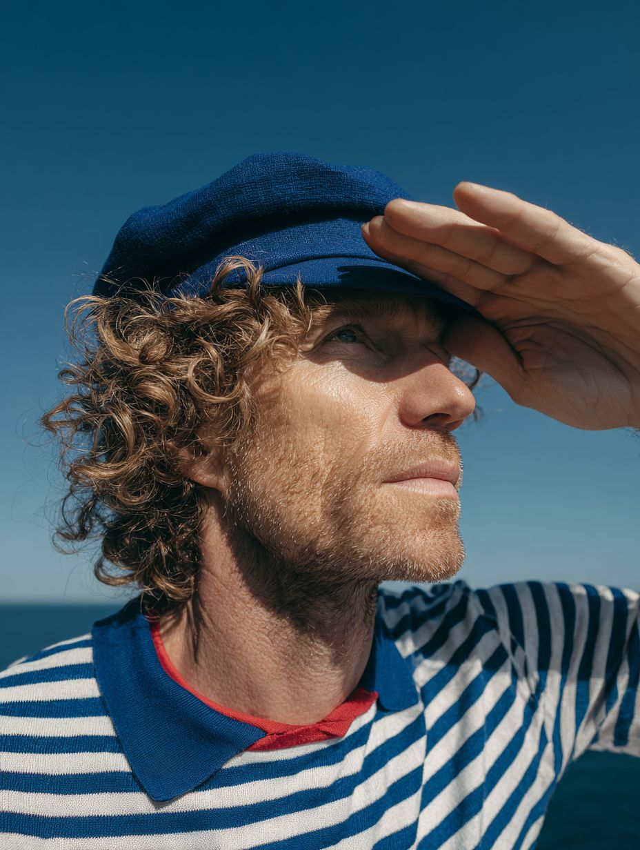 Ultra-realistic high-quality photograph of the contemporary 40-year-old smiling man with light-brown curly hair. He wears a blue sailor cap and a short-sleeve polo shirt with wide blue-and-white horizontal stripes and a red collar. The man places one hand on his forehead, as if scanning the horizon in the distance. Strong heroic pose, confident silhouette. Background: intense deep-blue sky, clear weather, bright natural daylight. Sharp focus, rich textures of wood and fabric, natural skin tones, cinematic realism, professional photography, high detail, 85mm lens look, shallow depth of field --ar 3:4 --v 7.0