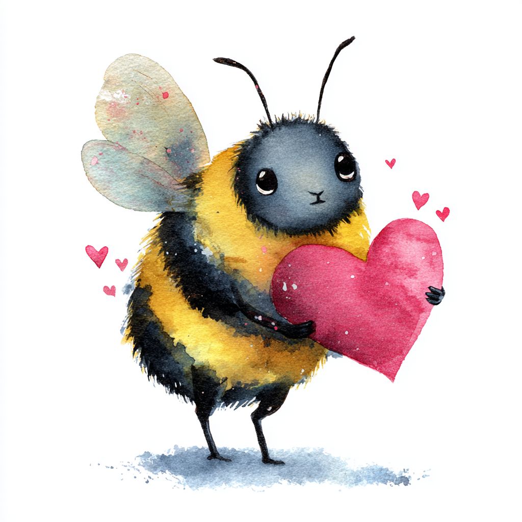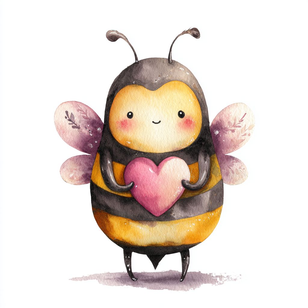 watercolour illustrated style, cute bee holding a heart --v 7.0