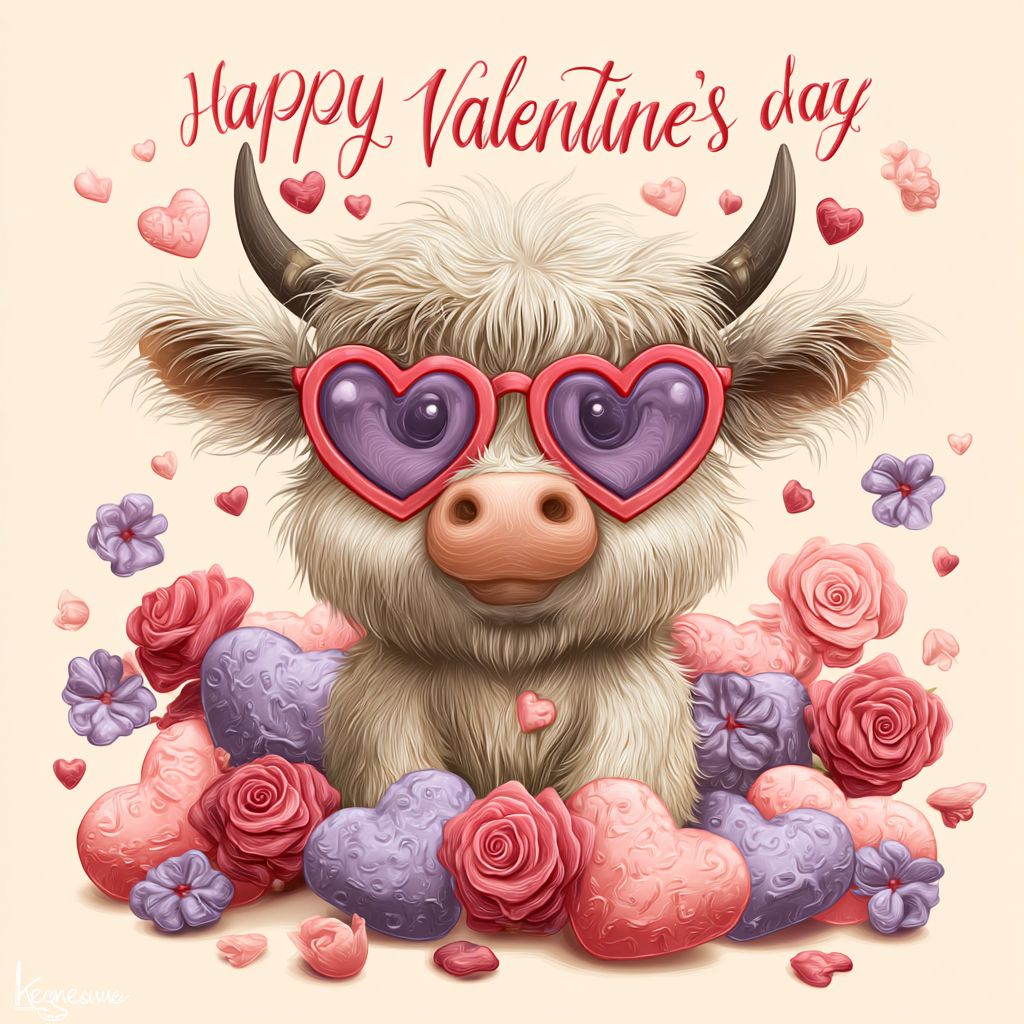A cute baby highland cow wearing heart-shaped sunglasses, surrounded by chocolates and roses