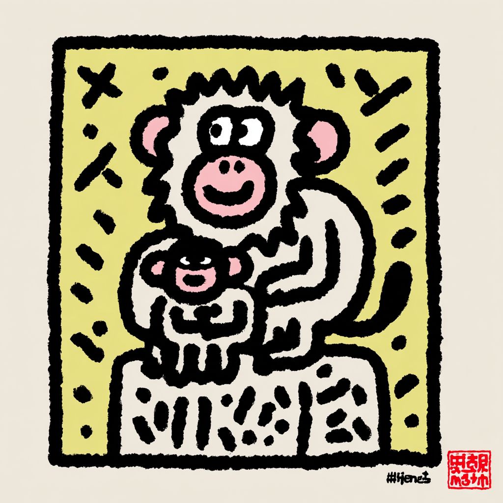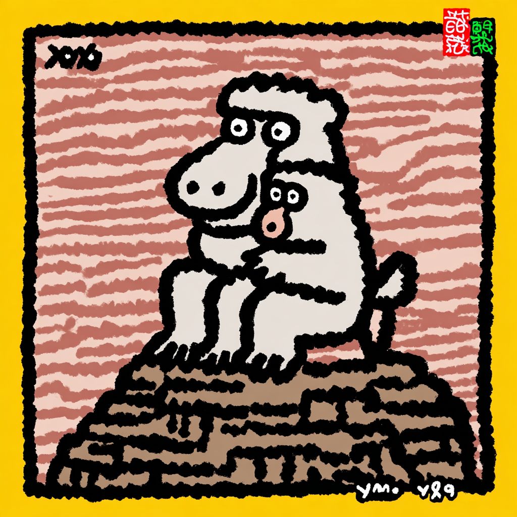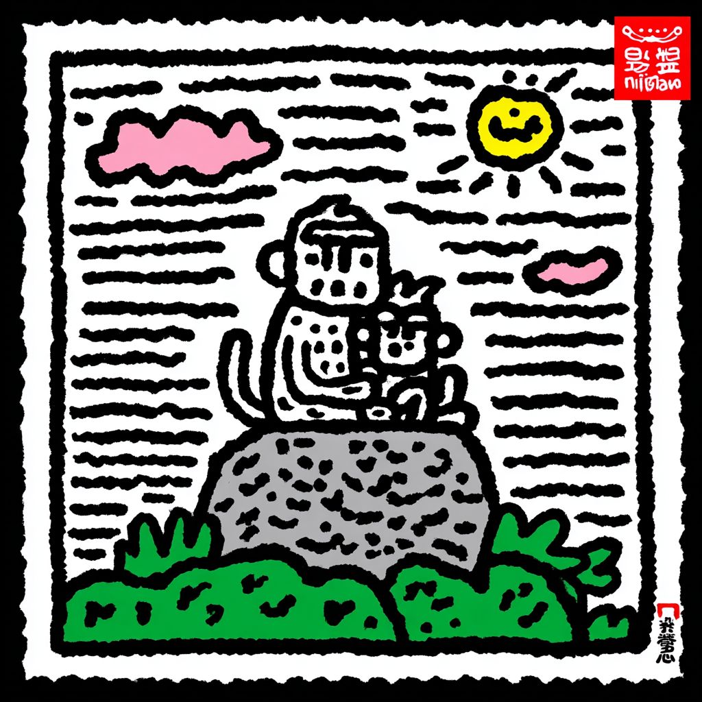 A mama baboon grooming her baby baboon while sitting on a rock, well-defined shapes, pure black and white line art --sref 1047829894 --v 7.0