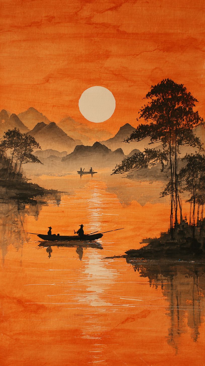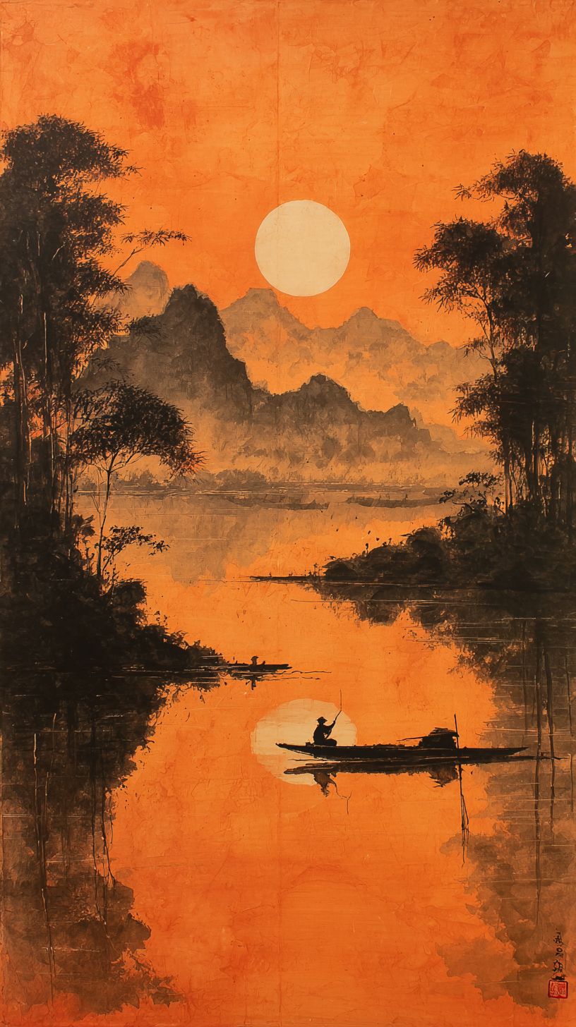 A new Chinese-style ink wash landscape painting that blends the texture of oil painting, featuring a theme of a sunset over the river at dusk. A large warm white sun hangs in the orange-yellow gradient sky, casting rosy light on the river's surface, creating shimmering reflections. The river acts like a mirror, reflecting the sunset, mountains, and fishing boats. A narrow boat floats on the river, with a fisherman’s silhouette quietly sitting and fishing. The background showcases layered ink wash mountains, while the trees along the shore are outlined with bold ink strokes. The painting combines the ethereal quality of ink wash with the light and shadow texture of oil painting, dominated by warm orange and deep black tones. The brushwork is both rough and delicate, with the texture of rice paper, rendered in 8K ultra-fine detail. --ar 9:16 --v 7.0