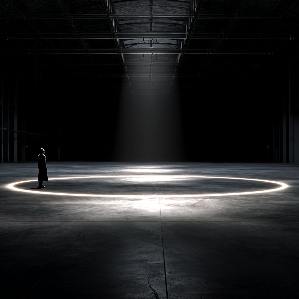 In a vast dark exhibition hall, someone is moving within a circle of light on the floor while wearing headphones