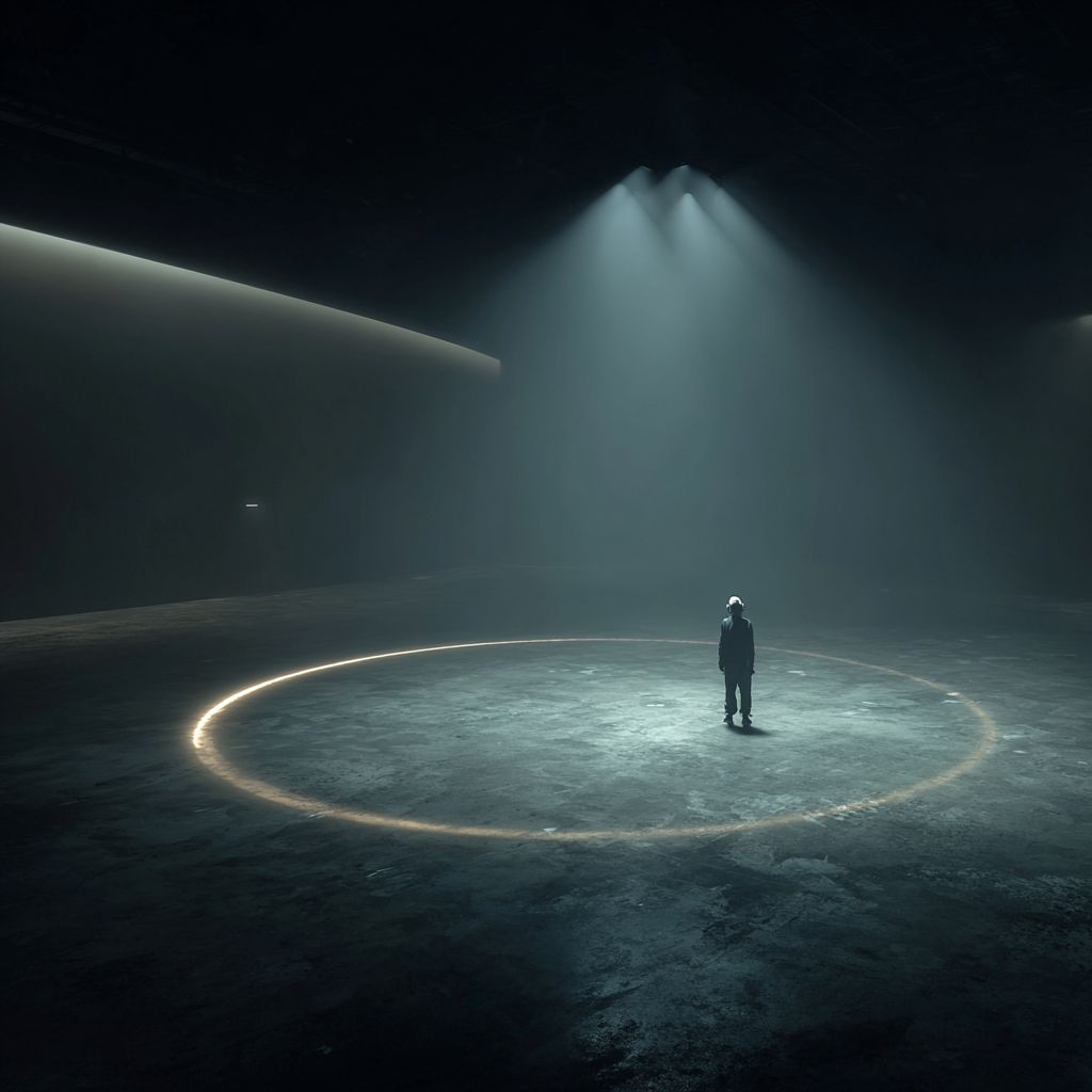 a realistic vast and empty exhibition hall plunged in darkness with just ray of light coming from ceiling, shaping a small circle of light on the floor, someone equipped with headphones is moving on the circle --v 7.0