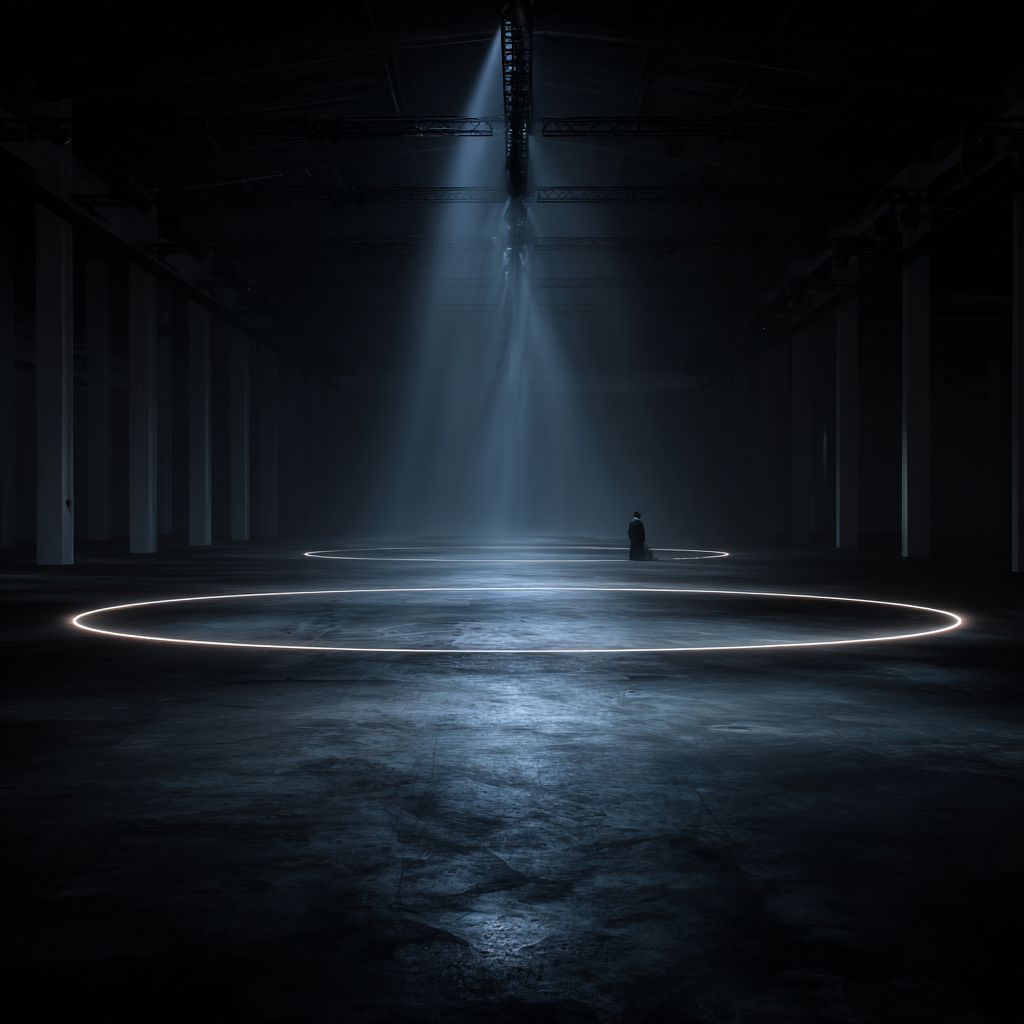 A realistic vast and empty exhibition hall plunged in darkness with just a ray of light coming from the ceiling, shaping a small circle of light on the floor, someone equipped with headphones is moving on the circle.