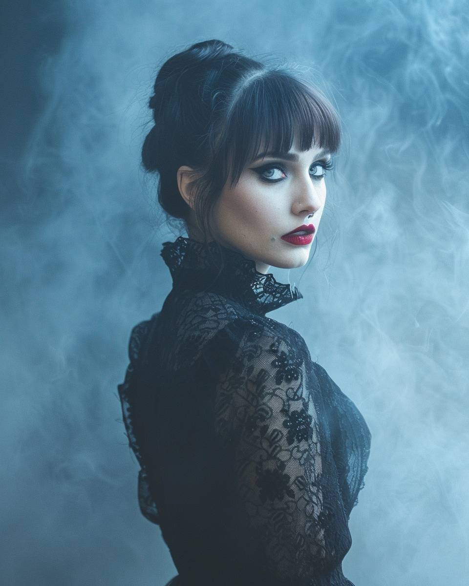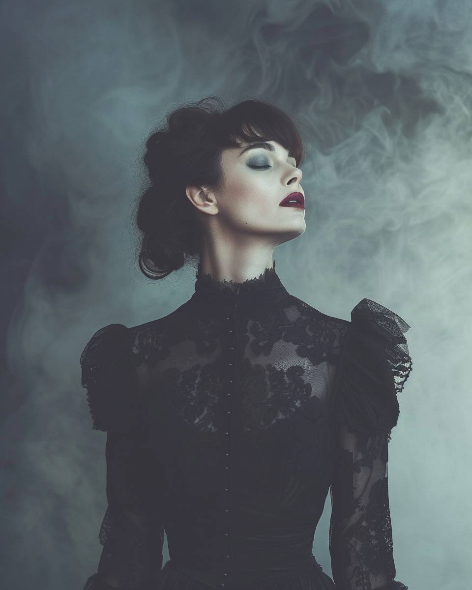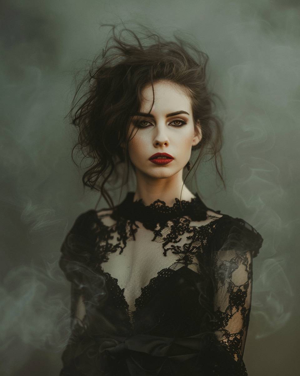 An eerie color photographic portrait of a woman in gothic style dresses, with red lipstick, set against a misty dramatic background.