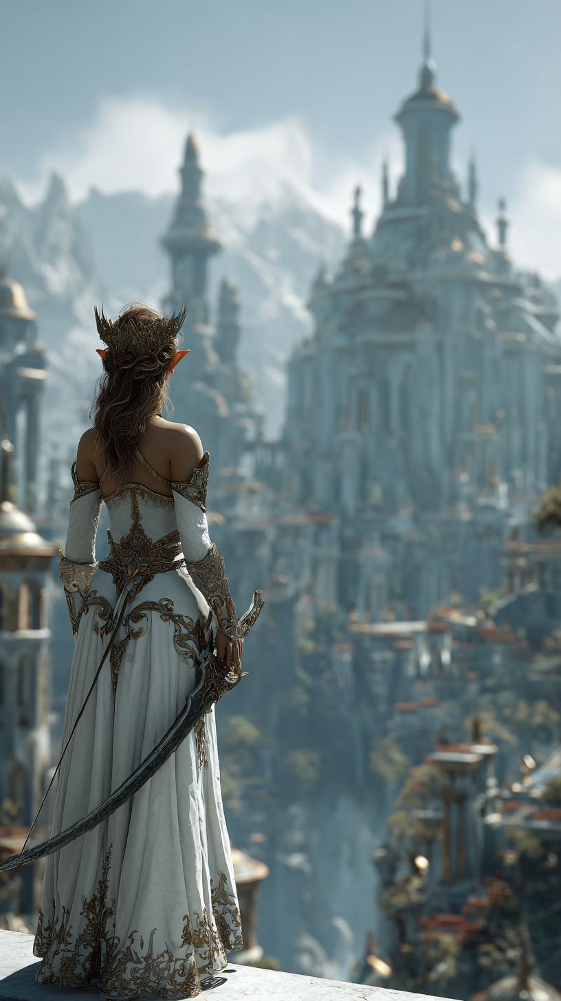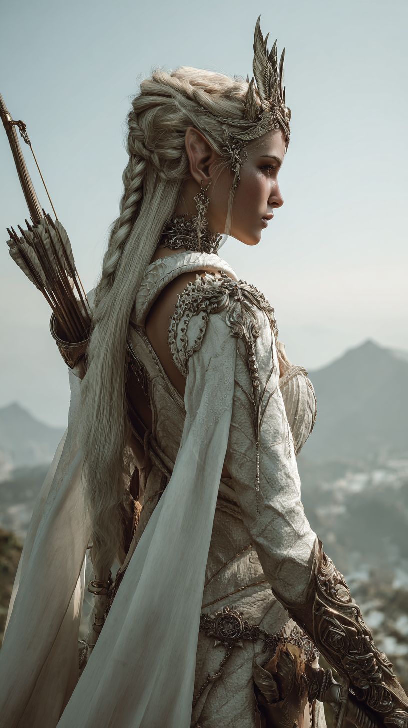A queen in a white dress lines up holding a weapon in a magical elf world