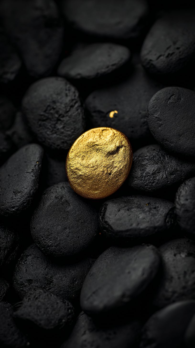 Macro photograph, high contrast, black Pebble pieces surrounding a big single, very big vibrant gold in the absolute center. Dramatic studio lighting, sharp focus on the textures, deep shadows, professional product photography style --ar 9:16 --stylize 50 --v 7.0