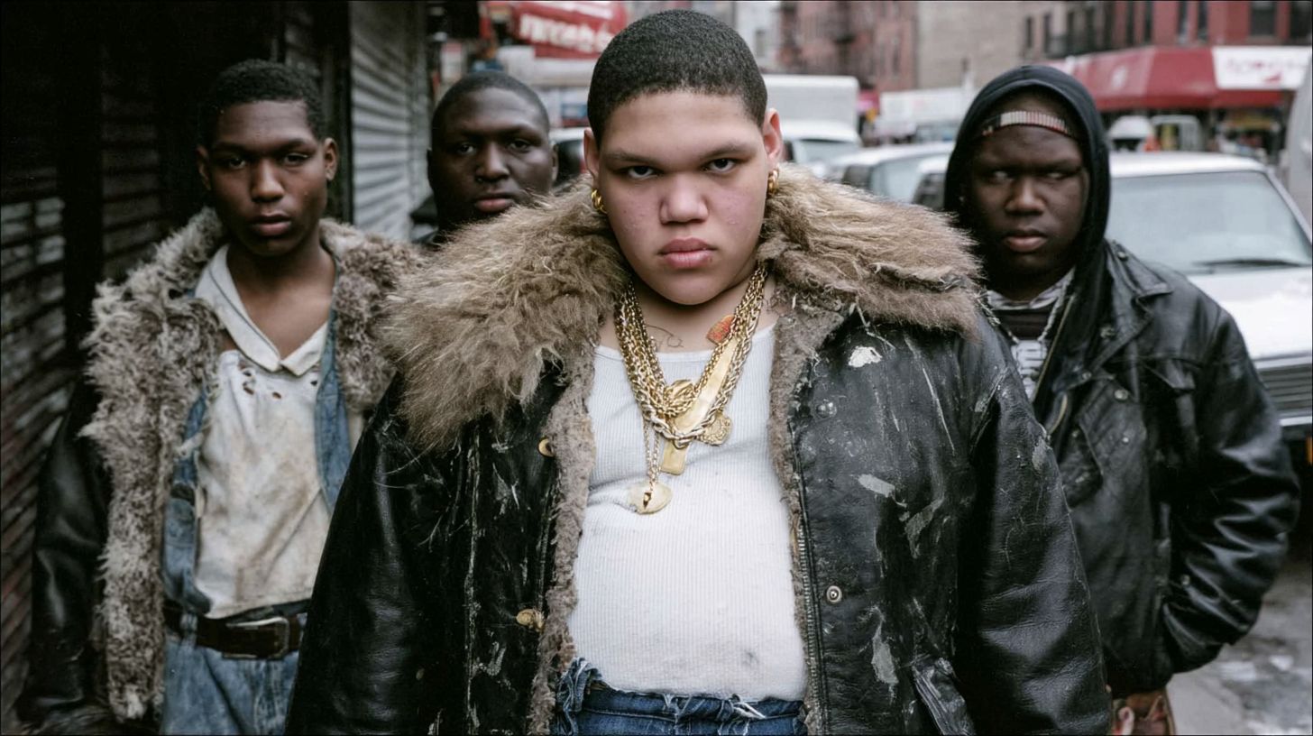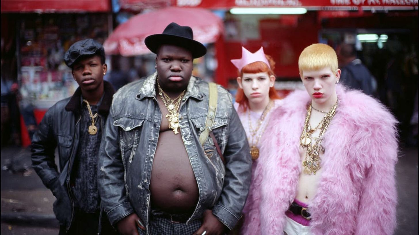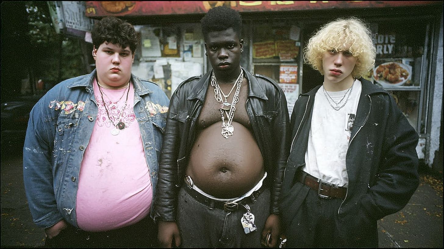 A medium format color portrait with a shallow depth of field and swirly bokeh, where the object in focus is very crisp and sharp, depicting a group of young, fat, obese, overweight, diverse, trans, and non-binary people in the streets of Harlem, New York.