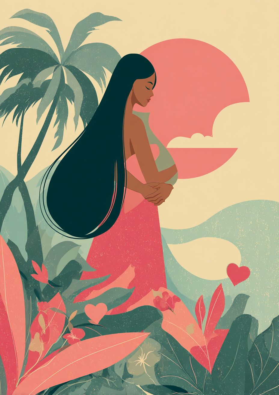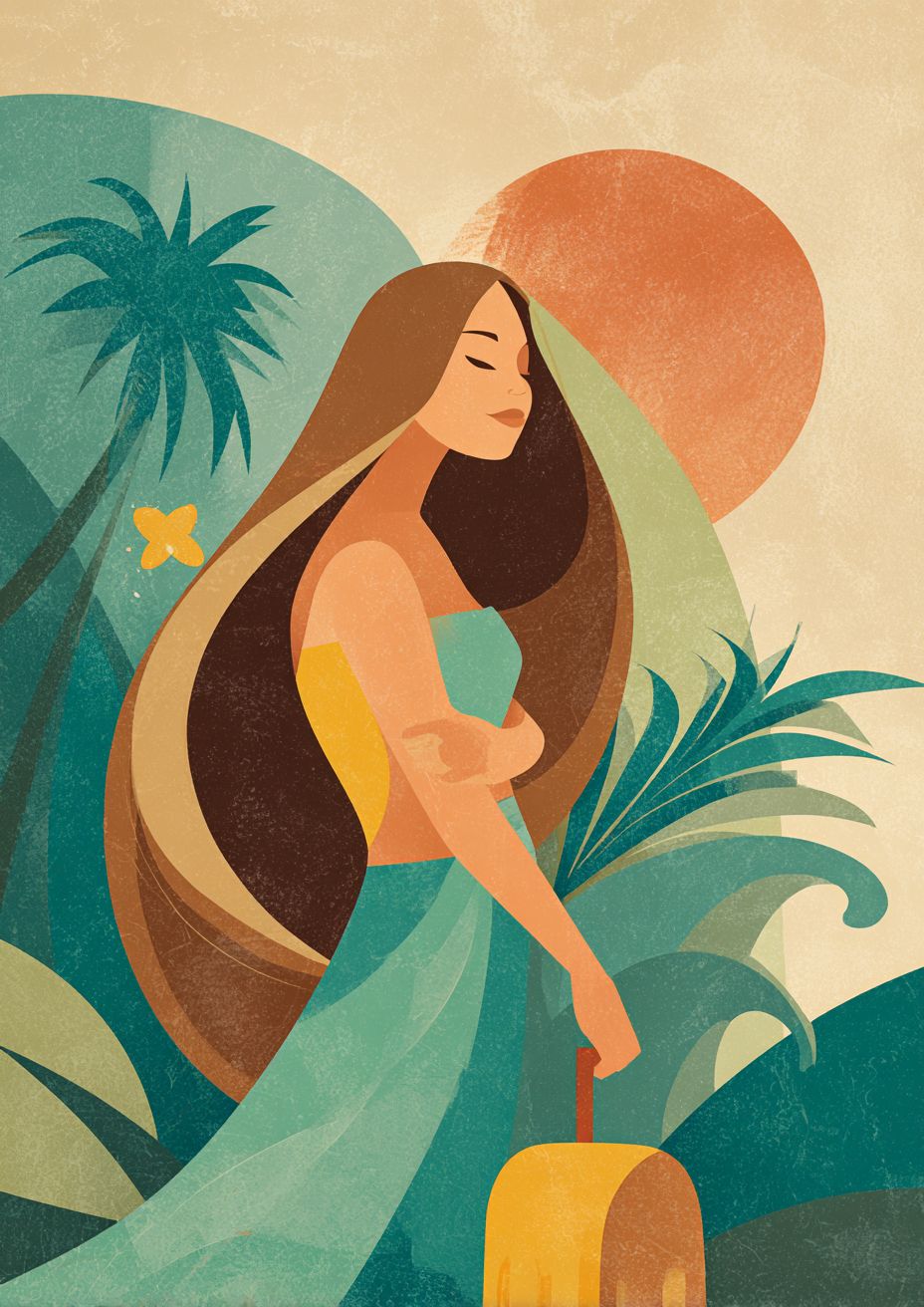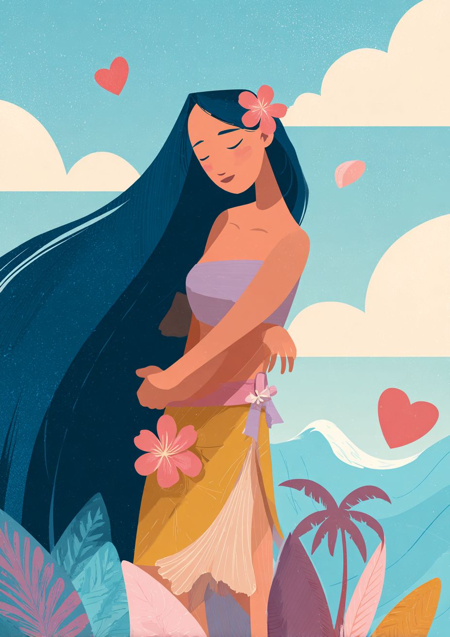 spa travel modern poster, evoking purity, hula girl hugging with long hair, holding hands with hula boy, love hearts, sarong, rest, surf, zen, hawaii, spa life, air travel --ar 5:7 --v 7.0