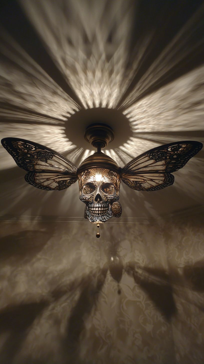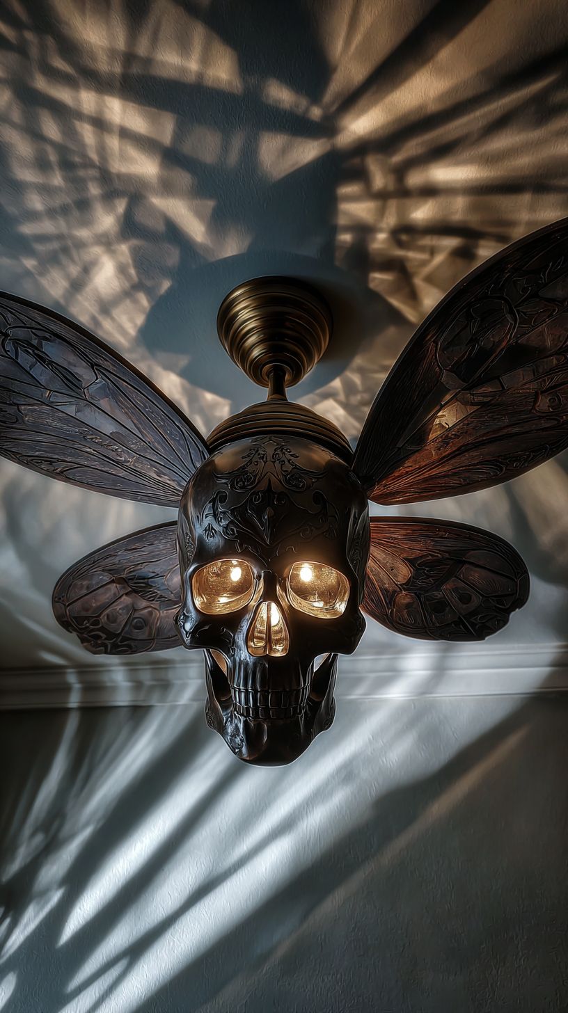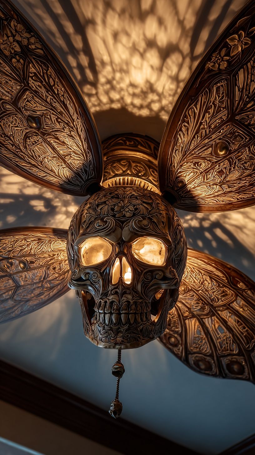 the ceiling fan is shaped like an intricately carved skull, with butterfly wings painted on the blades and glowing eyes in its center. the light from within casts eerie shadows across the room, creating mesmerizing patterns on the walls and ceilings. this unique design adds a touch of dark fantasy to any space in which it is placed. --ar 9:16 --v 7.0