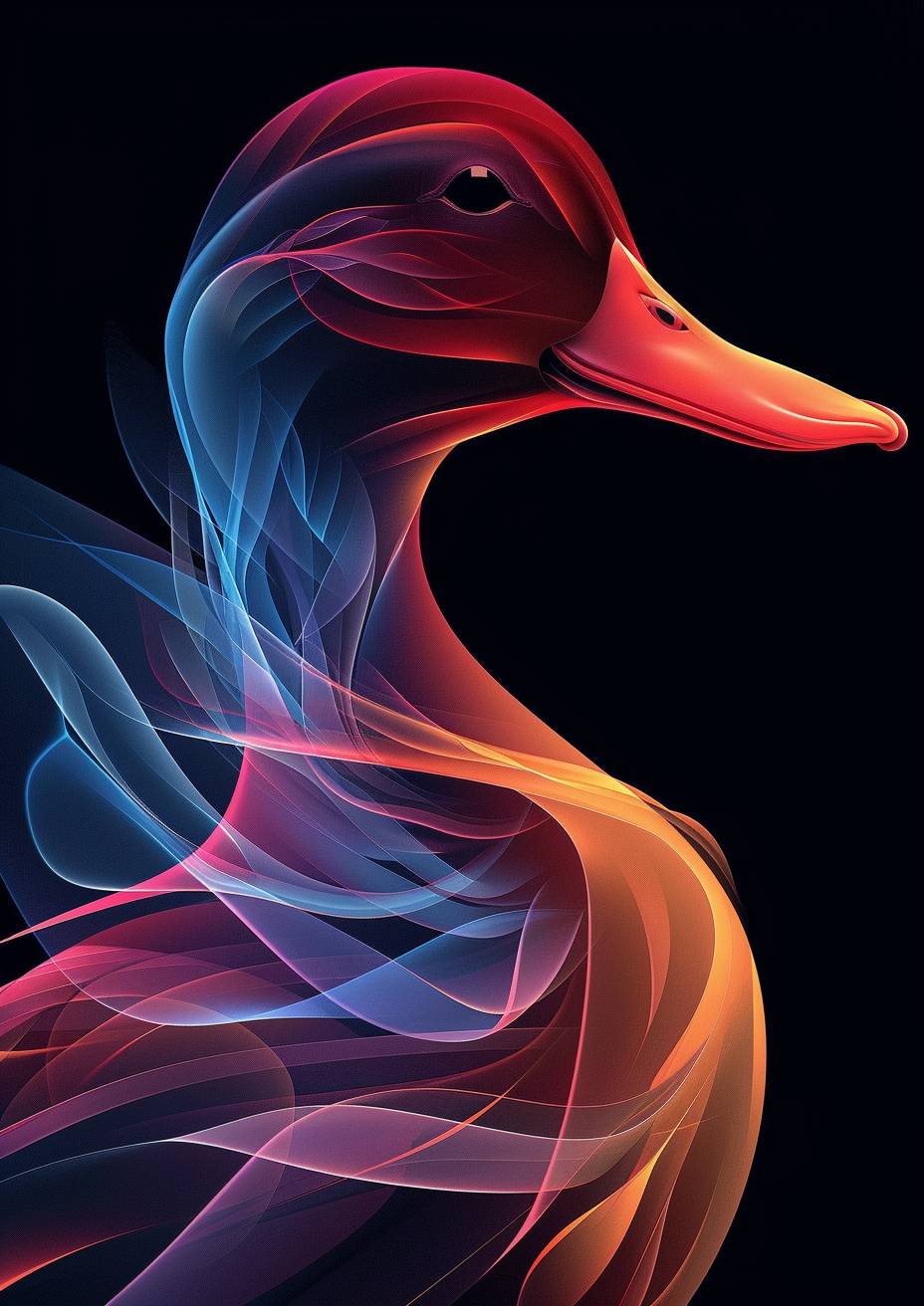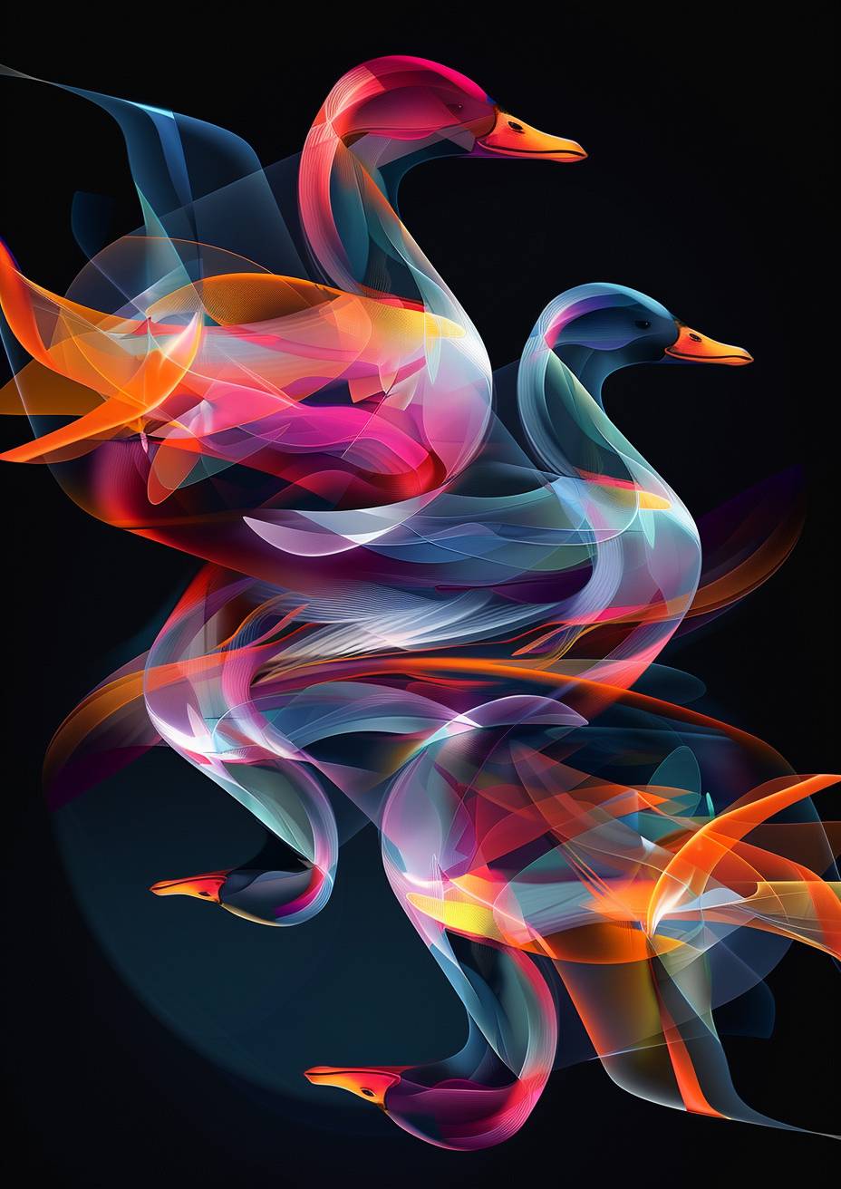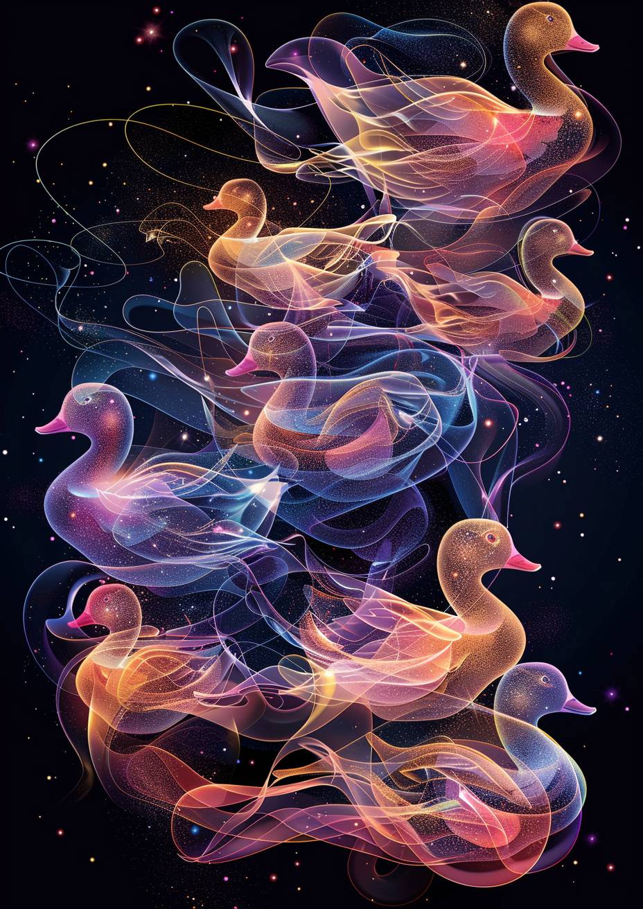 Minimalist vector art, hard edges, elegant curves, glowing holographic duckies, negative space, black background