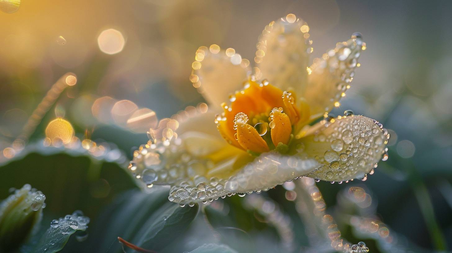 Photorealistic image, macro photography, 105mm lens, delicate petals covered in morning dew, beautiful flower, nature, spring