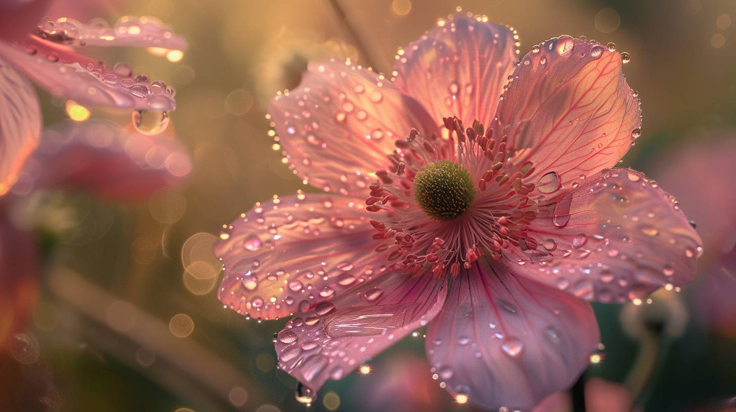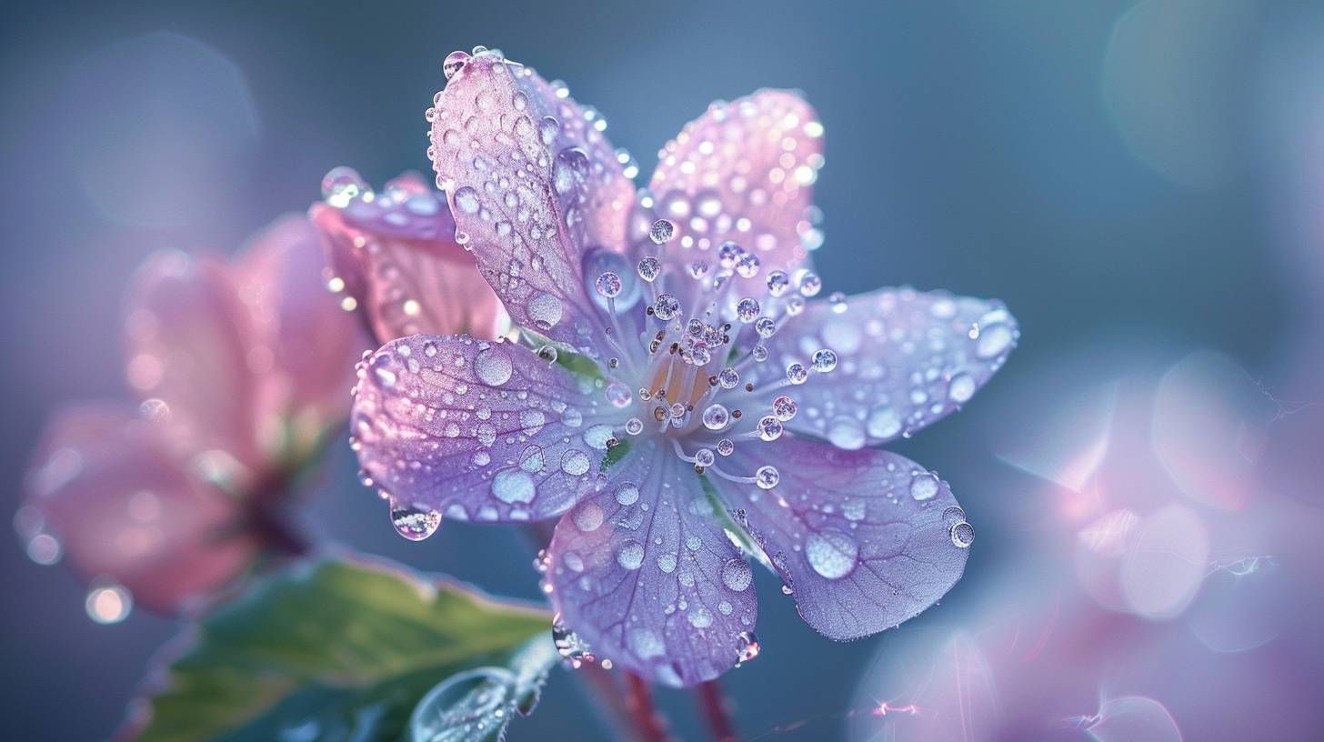 photorealistic image, macro photography, 105mm lens, delicatepetals covered in morning dew, beautiful flower, nature, spring --ar 16:9 --v 6.0