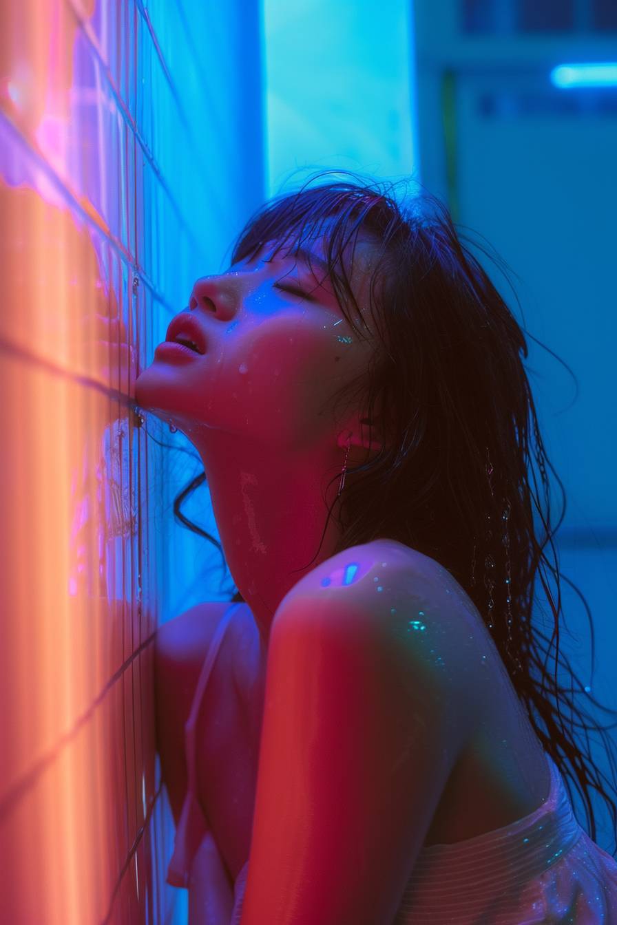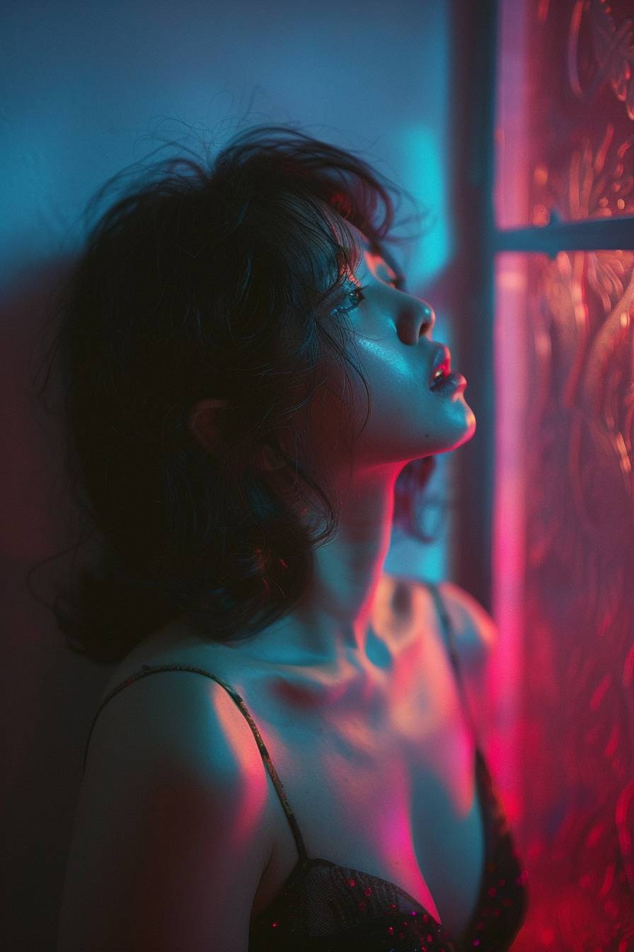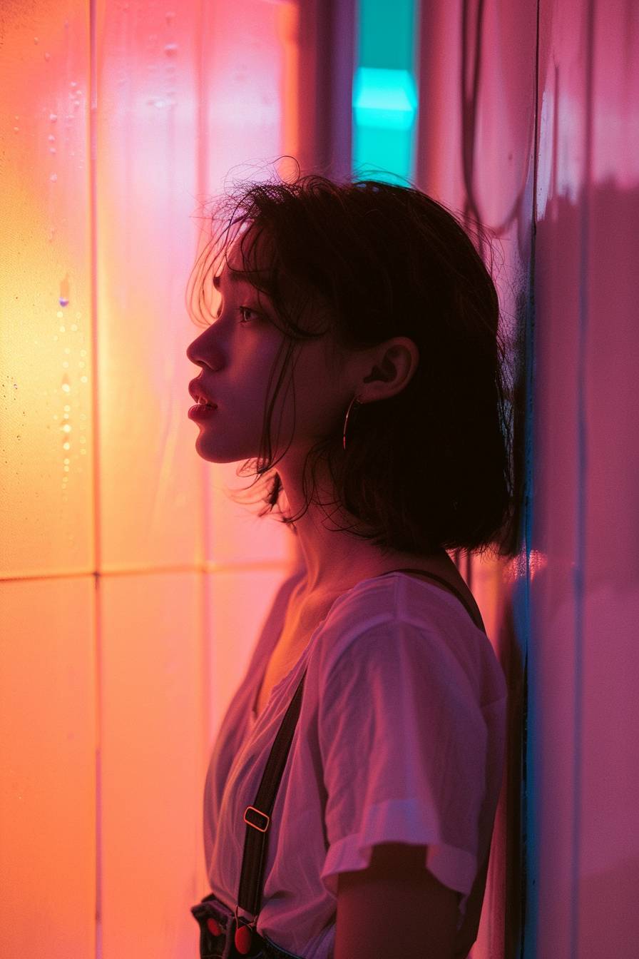 A side profile of a woman crying, who looks withholding; captured in the style of Leica M6, vaporwave, full body shot.