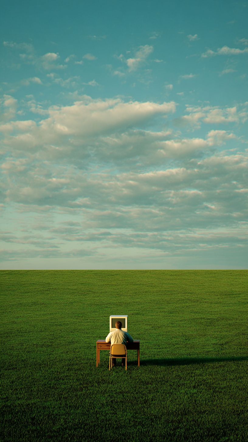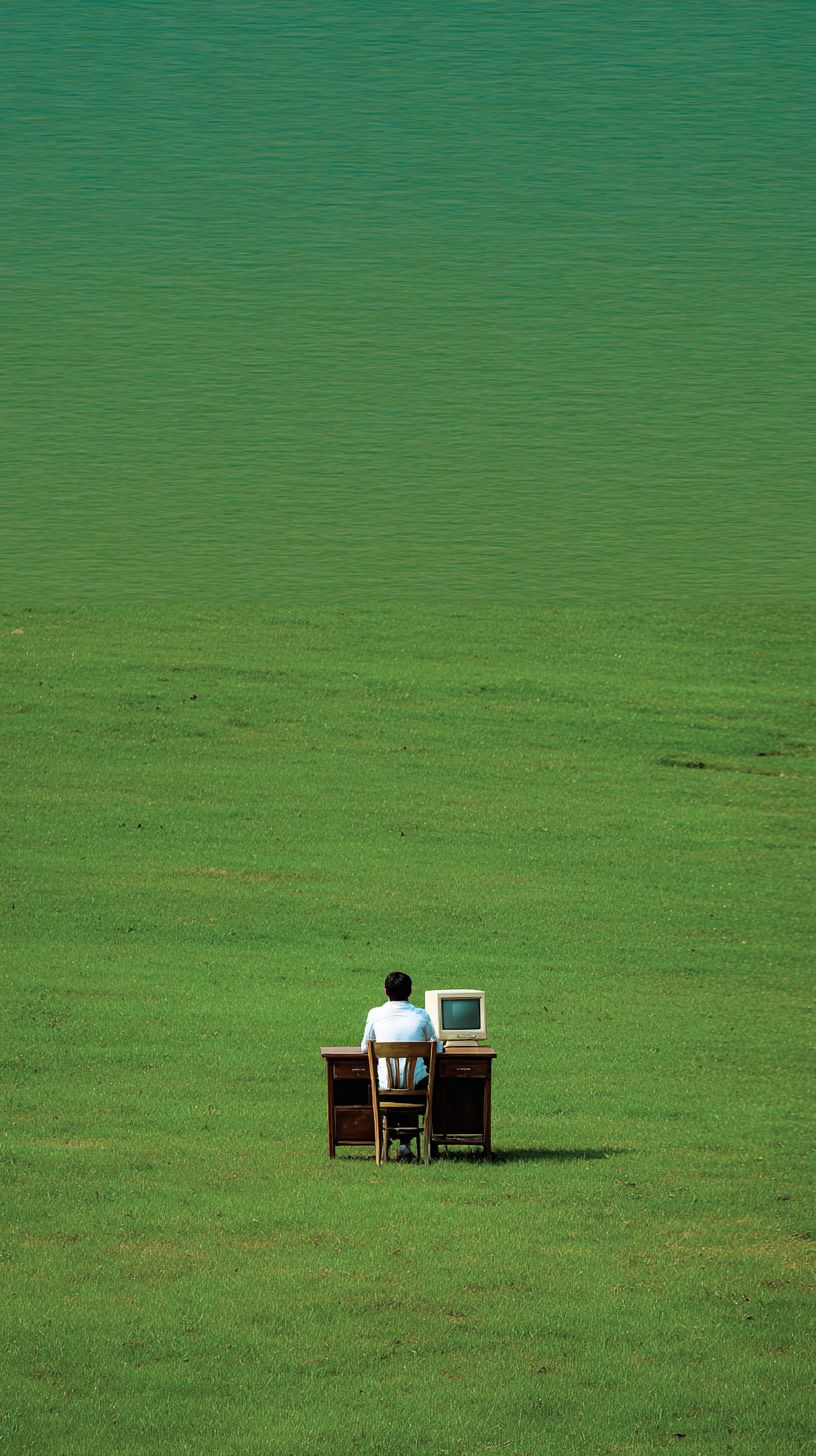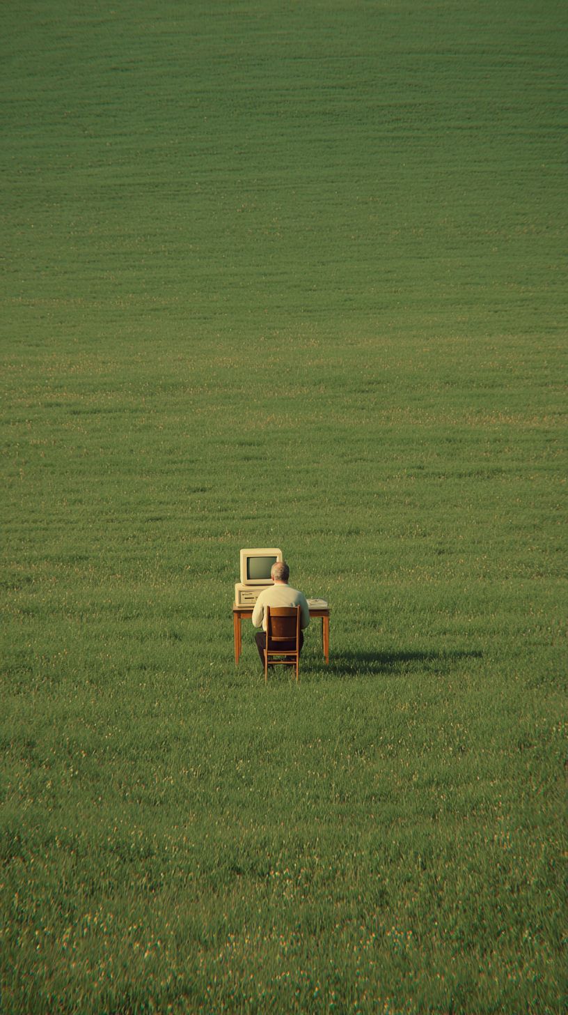 A distant wide shot of a solitary man sitting at a small wooden desk with a beige computer in the middle of an endless green field.