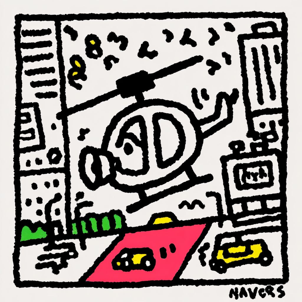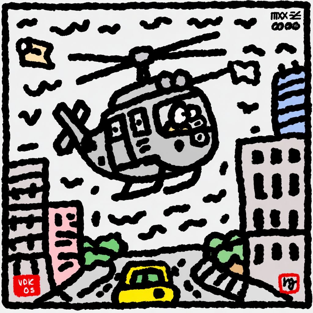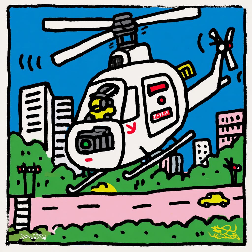 A news helicopter hovering over a city street with camera equipment visible, filming below, tall buildings surrounding, and traffic visible on roads, bold clean lines, pure black and white line art --sref 1047829894 --s 50 --v 7.0 --raw