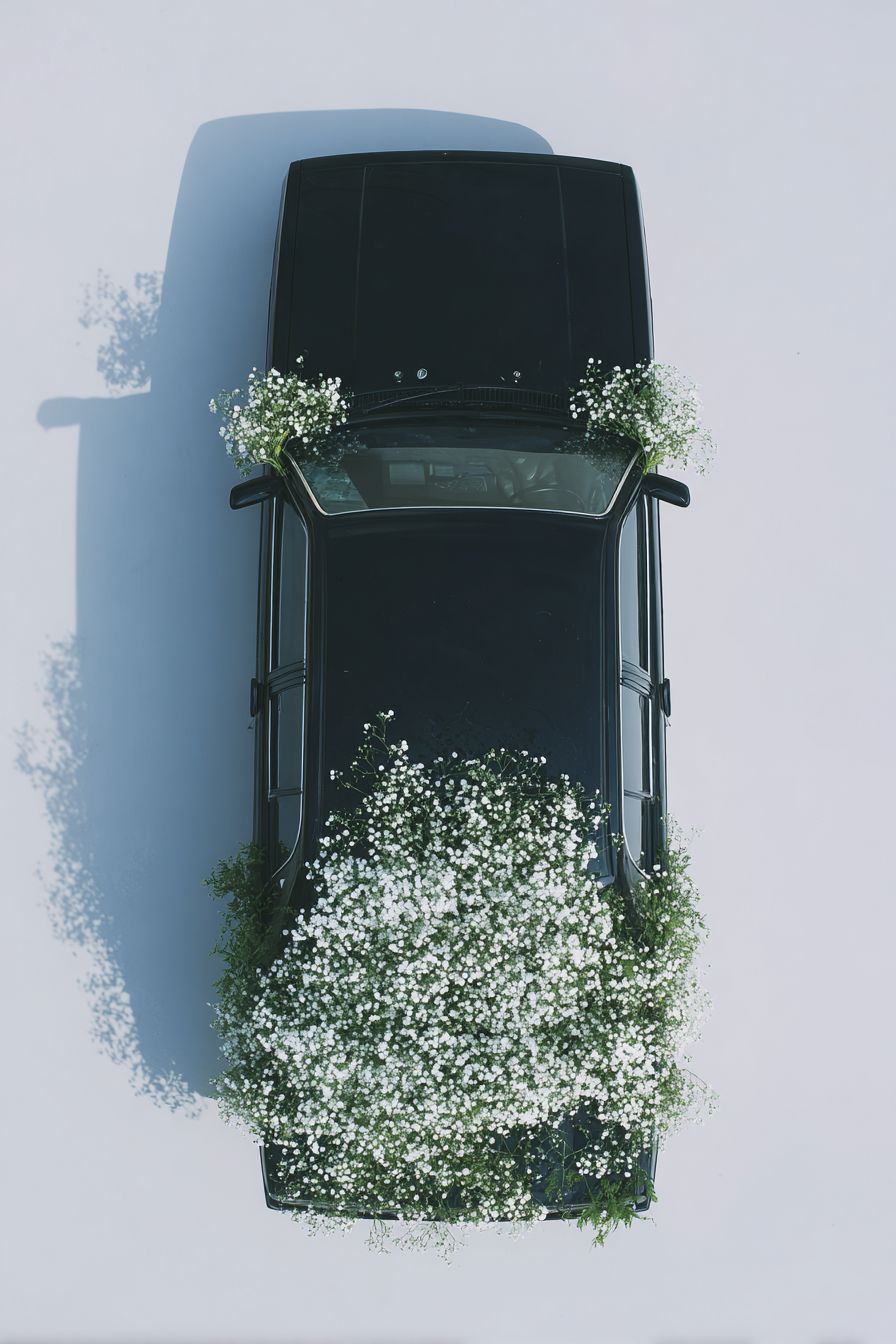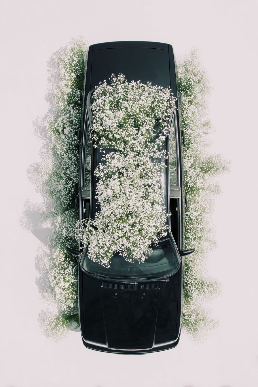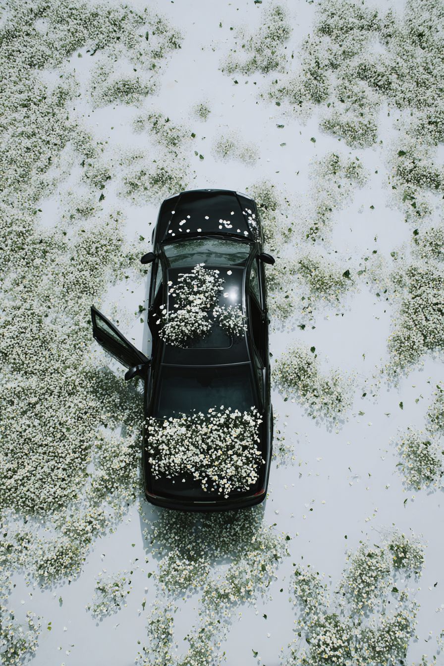 black car, top view of the roof covered with small white flowers, white background, high-definition photography, minimalist style, top-down perspective, high resolution, professional studio lighting, precise details, perfect lines, clear focus, high quality. the entire black car is seen from above, with its doors open and decorated in baby's breath and greenery. --ar 85:128 --raw --profile bx7kdp6 --stylize 50 --v 7.0