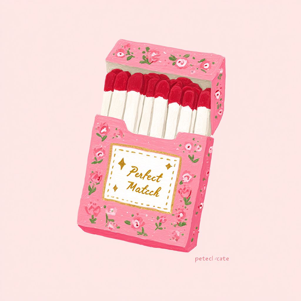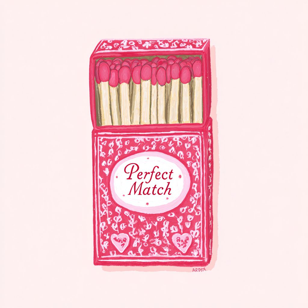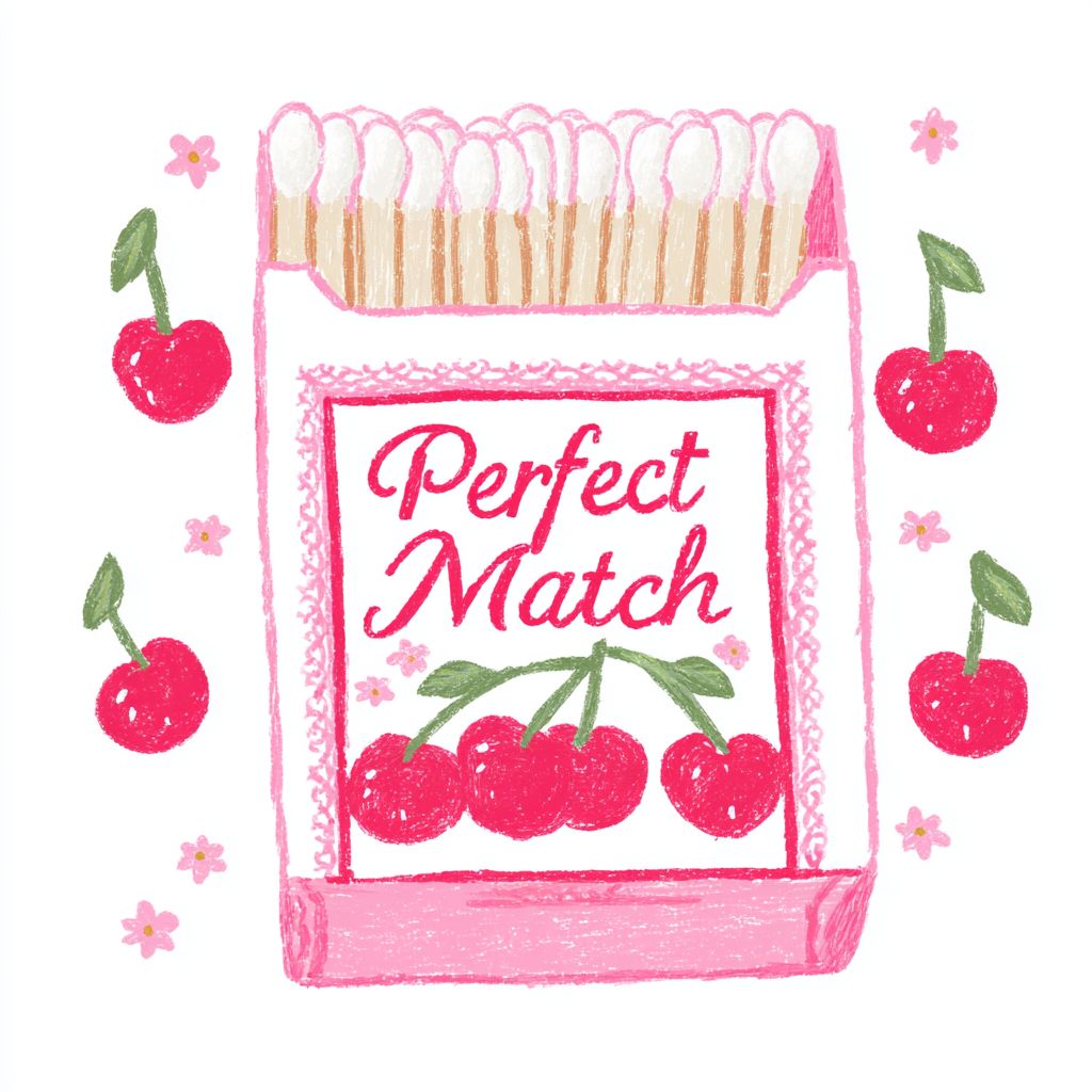 Illustration of a 'Perfect Match' match box in hand-drawn style with a dreamy pastel atmosphere
