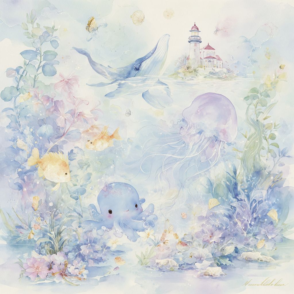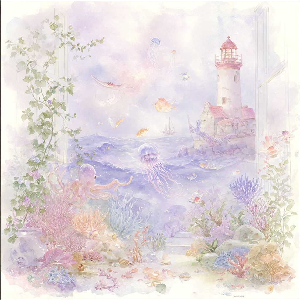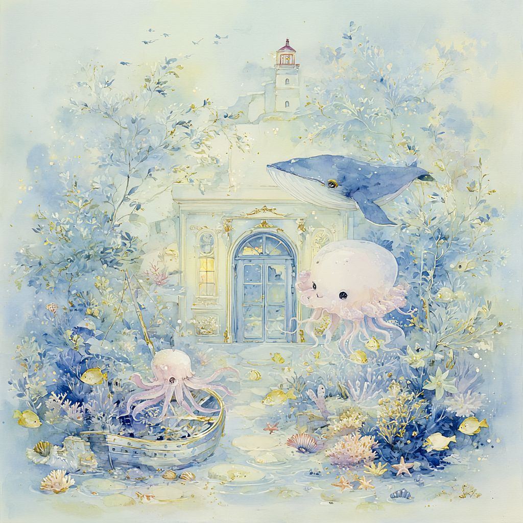 A magical underwater trompe-l’œil illustration on a pure white background, in a whimsical, storybook style. The scene looks like an open window into a hidden ocean world, blending realistic depth with enchanting fantasy. In the foreground, a cute, wide-eyed octopus with tiny, playful tentacles floats gracefully, glowing softly as if lit from within. Nearby, a small, friendly jellyfish with a big smile drifts gently, its translucent body glowing in pastel pinks and blues. Around them, colorful corals, shimmering fish, and swaying seaweed create a dreamy marine garden. In the background, resting on the sandy seabed, lies a sunken shipwreck, its weathered wood covered in seashells, starfish, and tiny crabs. Schools of fish swim in and out of its broken windows. Above, a majestic yet gentle whale glides serenely, its presence adding calm and grace to the scene. At the top, where water meets the surface, a charming Breton lighthouse rises from a rocky island, its red and white tower casting a warm, golden beam across the waves. Sunlight filters through the rippling water, scattering magical sparkles over the entire composition. Everything should feel light, airy, and full of wonder, with soft gradients, delicate details, and a sense that the viewer could almost reach through the white background into this hidden ocean paradise --chaos 25 --ar 1:1 --profile er55fzr w6wm2fe --stylize 150 --raw