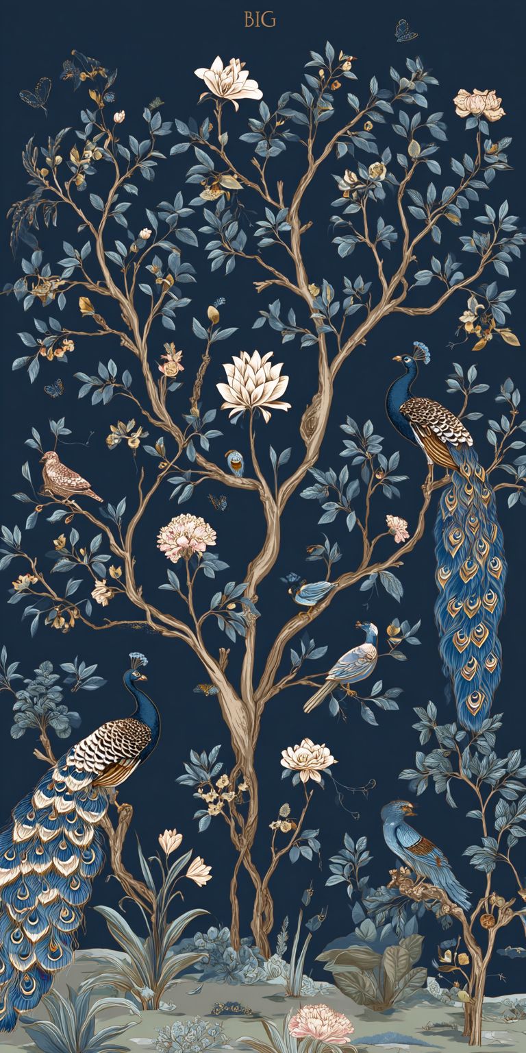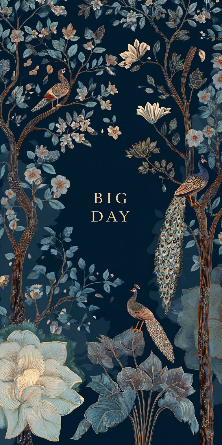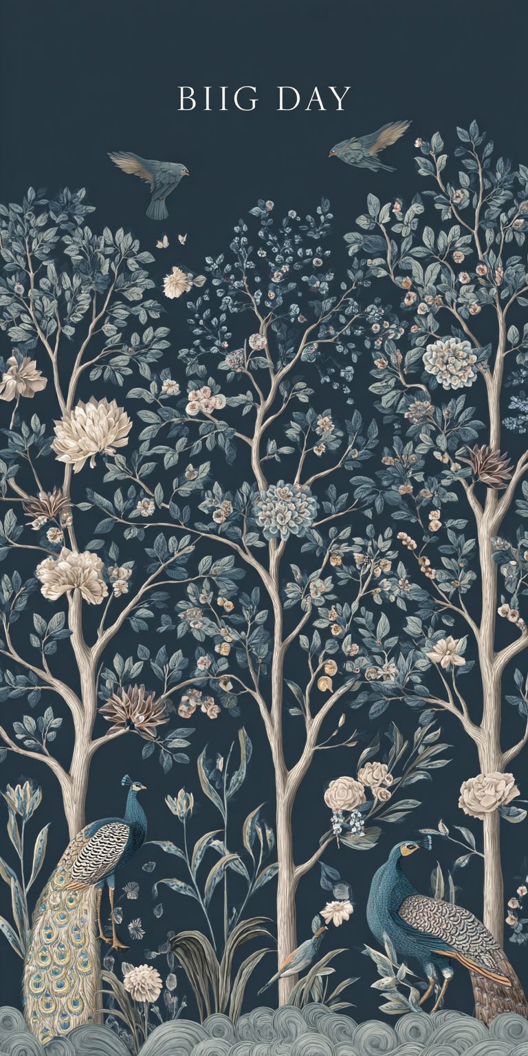 An elegant hand-painted mural illustration inspired by classical chinoiserie and Mughal miniature art. Stylized slender trees with winding branches fill the scene, covered in delicate flowers, buds, and small fruits. Exotic birds perch gracefully on branches, including peacocks with long patterned tails and small songbirds in soft blues and browns. The background is a deep midnight indigo, creating strong contrast with muted jade greens, dusty blues, soft creams, and pale florals. The composition is dense yet balanced, with fine botanical detail, painterly textures, and a calm, magical atmosphere. Flat perspective, ornamental symmetry, wallpaper-like continuity, highly detailed but refined, no modern elements, timeless and decorative. Put big bold text "BIG DAY" in the center of the image. it should be the focal point of the image and there should be lots of breathing room around it --ar 1:2 --s 50 --raw