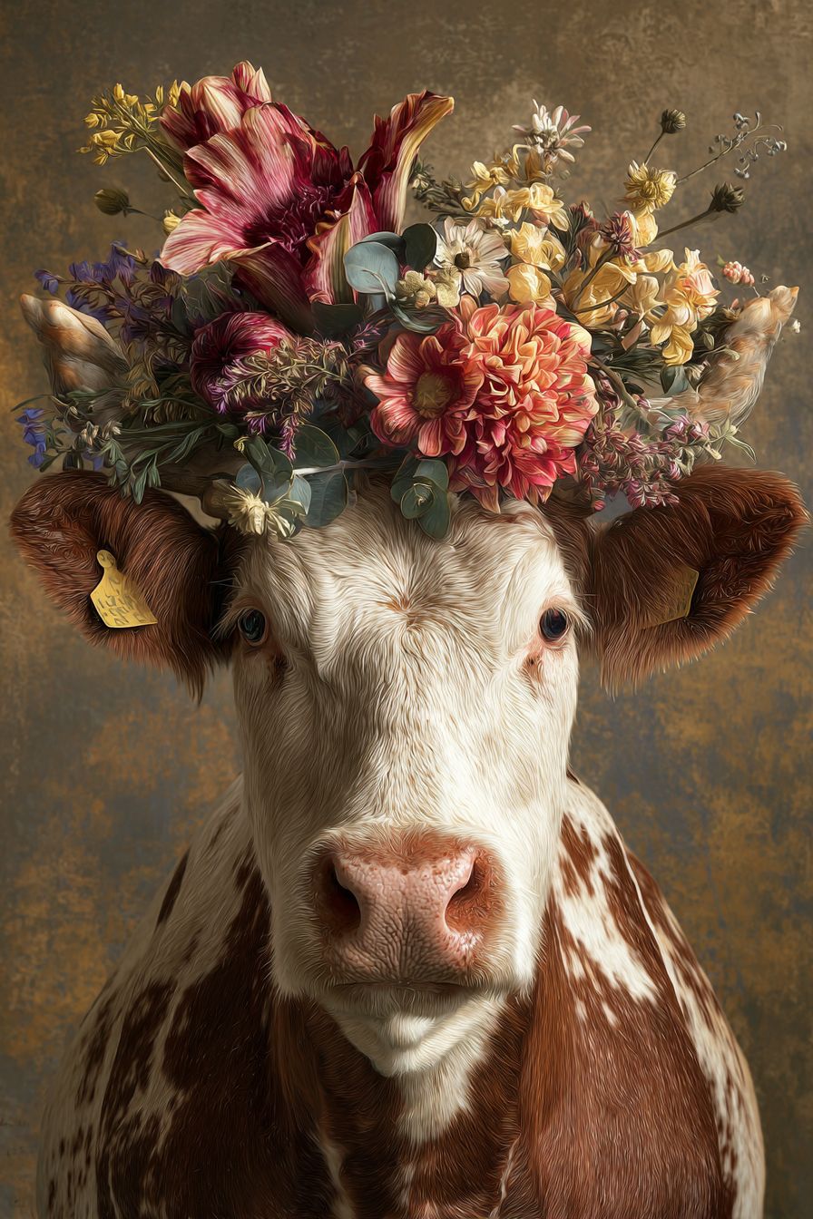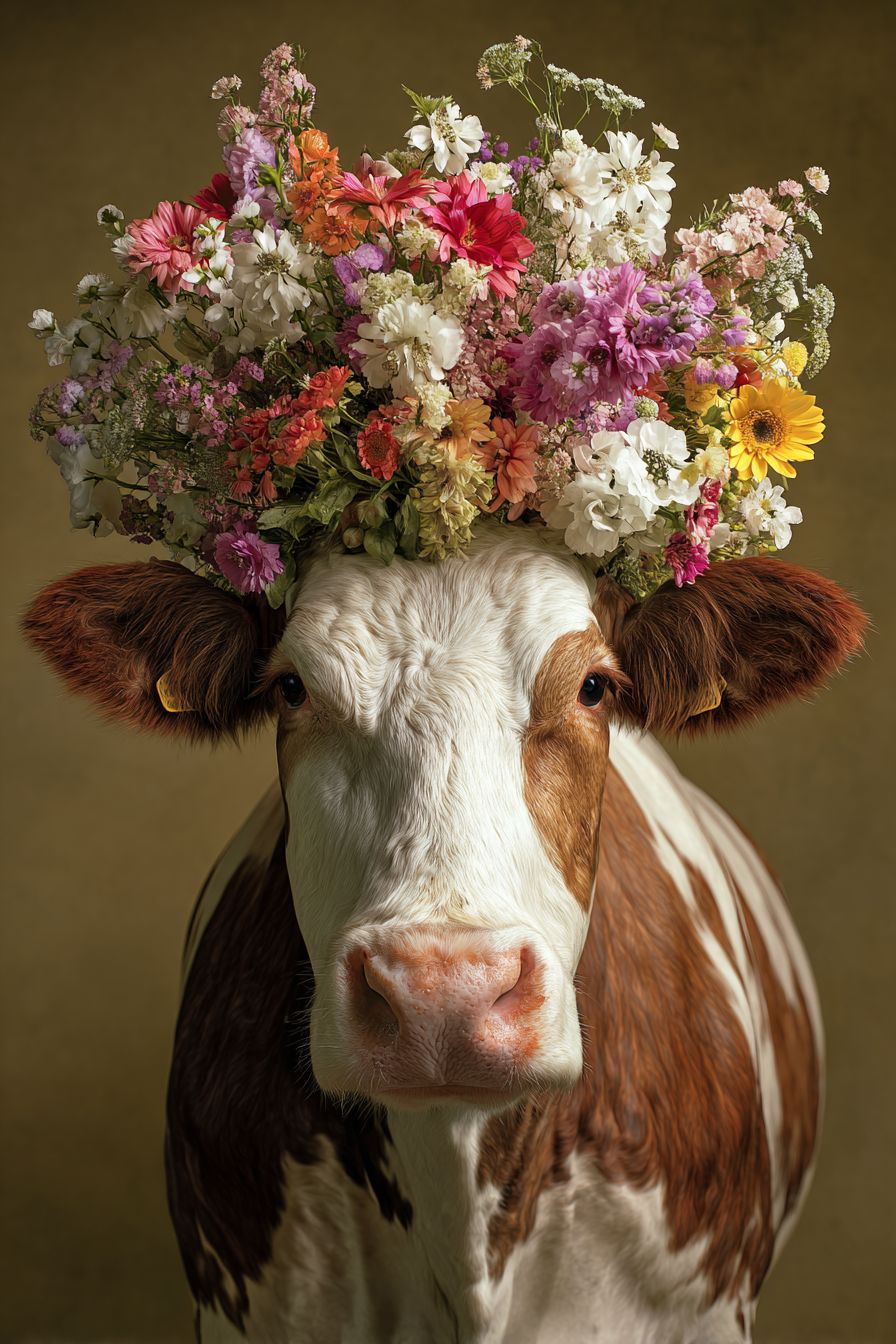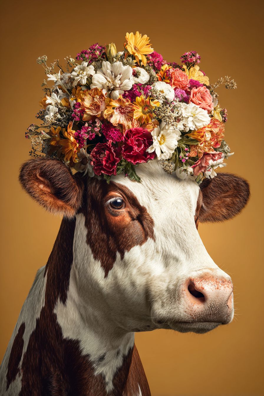 cow with a large bouquet on its head, portrait, warm background, realistic, photorealistic, ultra-detailed, high-resolution photography style, very realistic, very sharp, S raw, S 750 --ar 2:3 --s 50 --raw