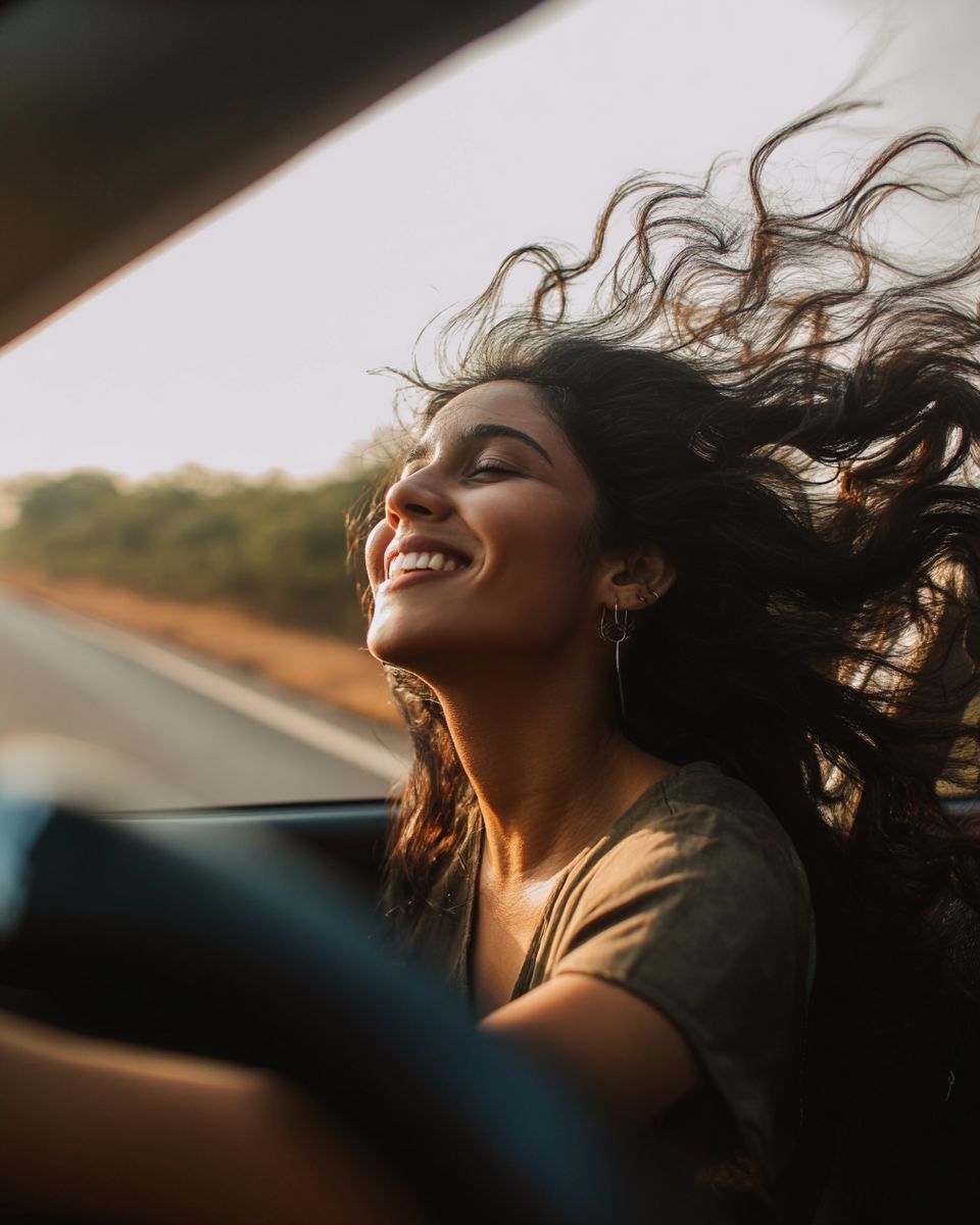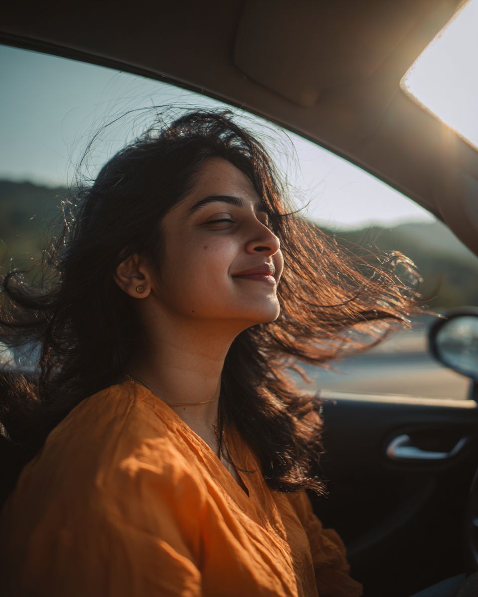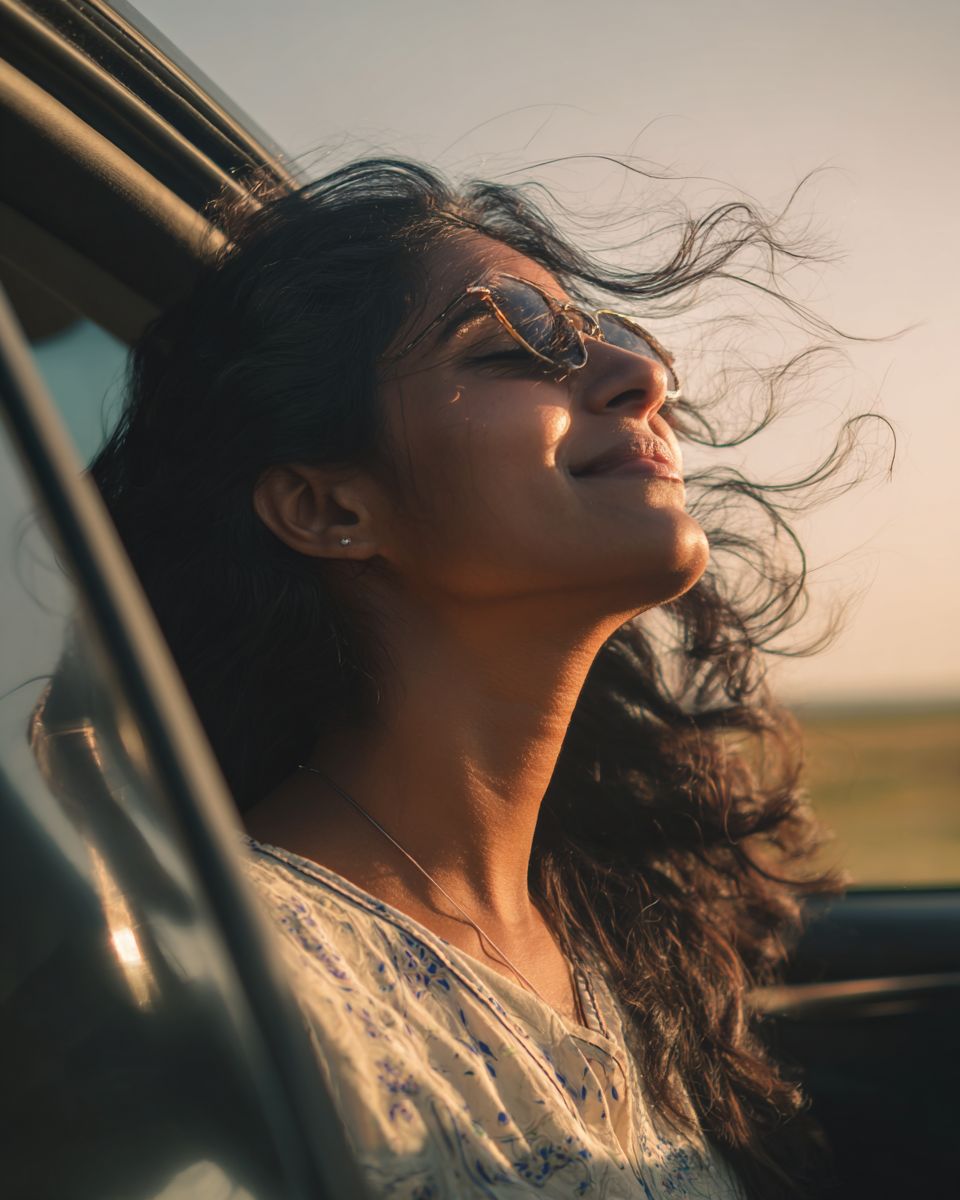 indian woman feeling free while driving --ar 4:5 --stylize 50 --raw
